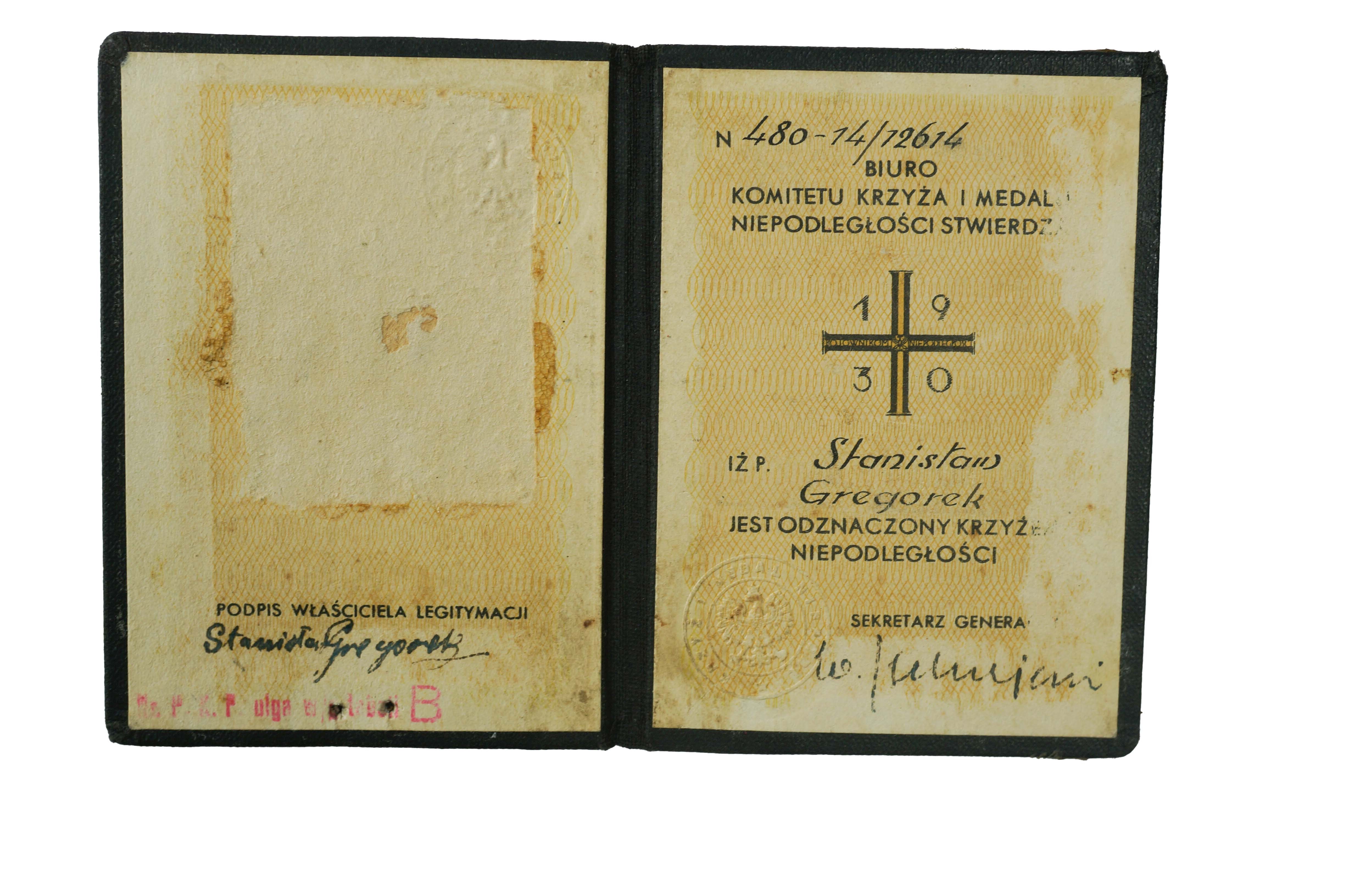II RP Legitymacja KRZYŻ NIEPODLEGŁOŚCI - Stanisław Gregorek, f. 7x9,6cm