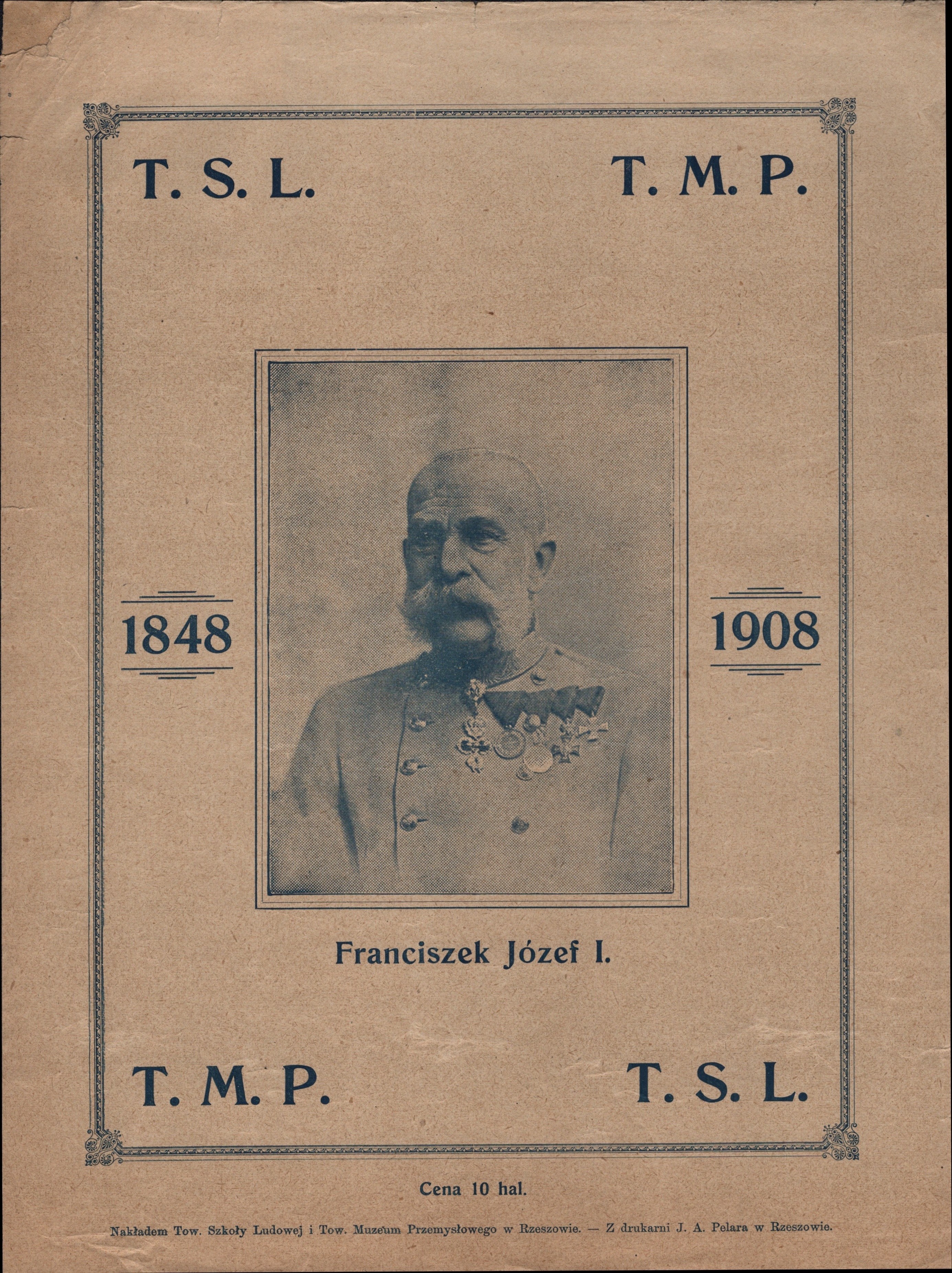 Plakietka okienna wydana z okazji Jubileuszu 50-lecia panowania cesarza Franciszka Józefa I. Nakładem Towarzystwa Szkoły Ludowej i Towarzystwa Muzeum Przemysłowego w Rzeszowie, z drukarni J. A. Pelczara w Rzeszowie.