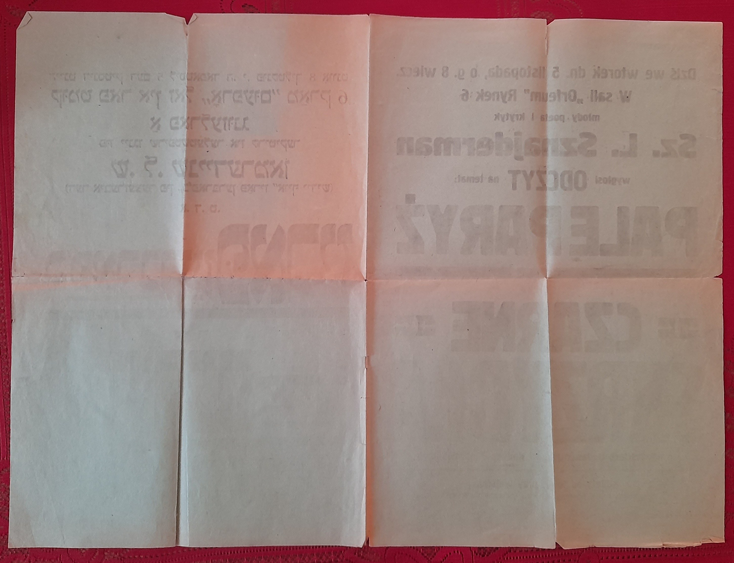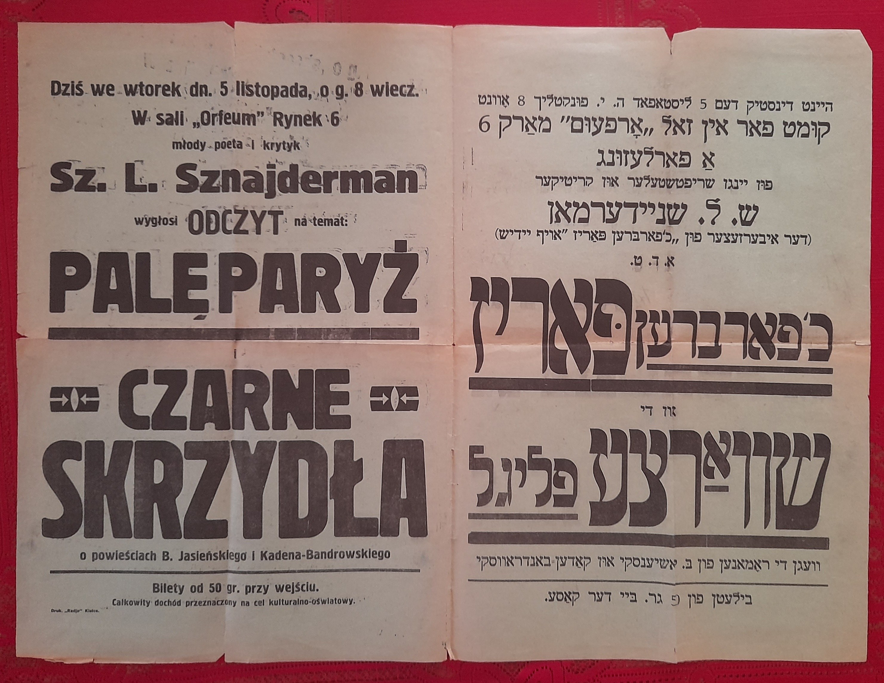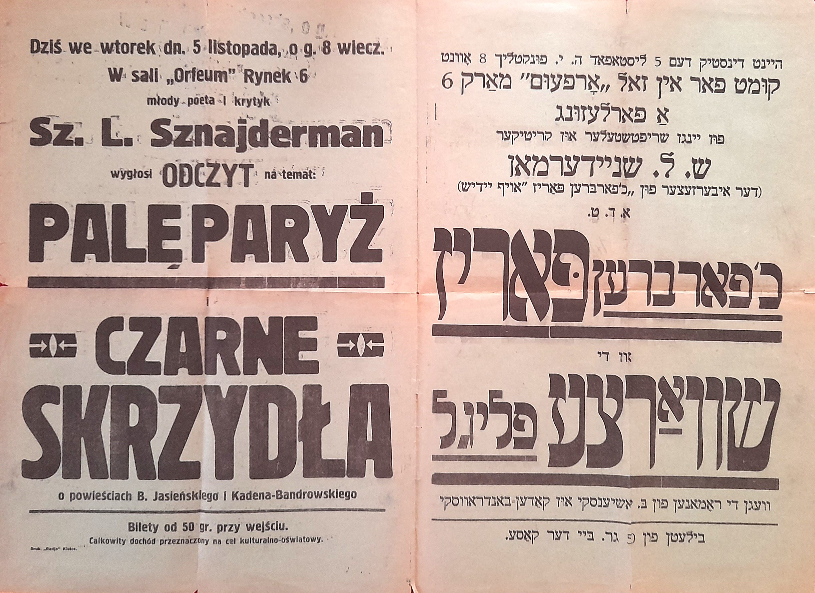 Kielce. Dwujęzyczny (polski i jidisz) afisz zapraszający na odczyt na temat Palę Paryż i Czarne Skrzydła o powieściach B.Jasińskiego i Kadena Bandrowskiego wygłoszony przez Sz.L. Sznajdermana w sali "Orfeum" Rynek 6 (zapewne w Kielcach) 5.11. [1929] o godz.8 wiecz. RRR(!)