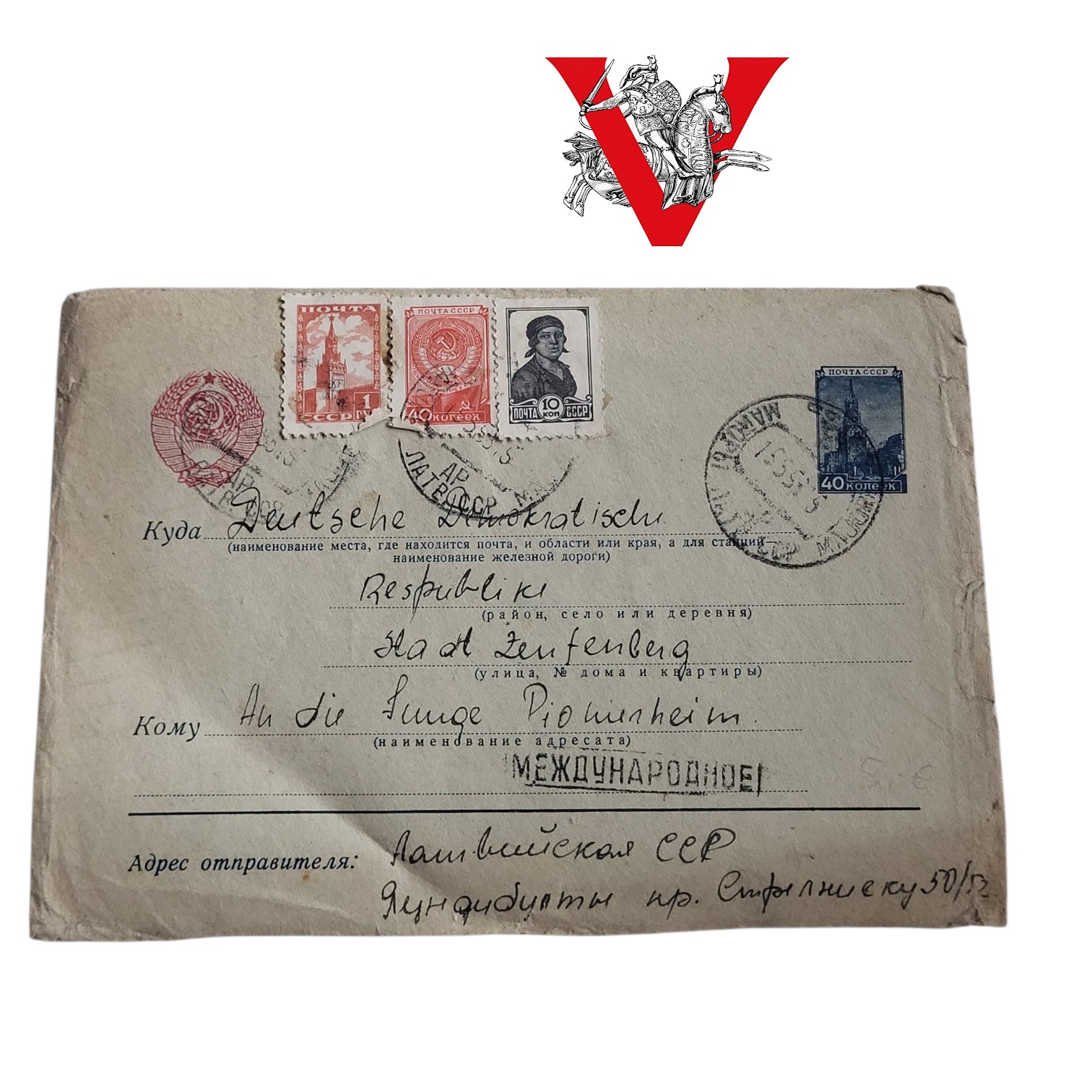 Na kopercie widoczne znaczki pocztowe ZSRR o nominałach 10, 20 i 40 kopiejek z wyraźnymi stemplami pocztowymi. Oznaczenie „МЕЖДУНАРОДНОЕ” (międzynarodowe) potwierdza przesyłkę zagraniczną.