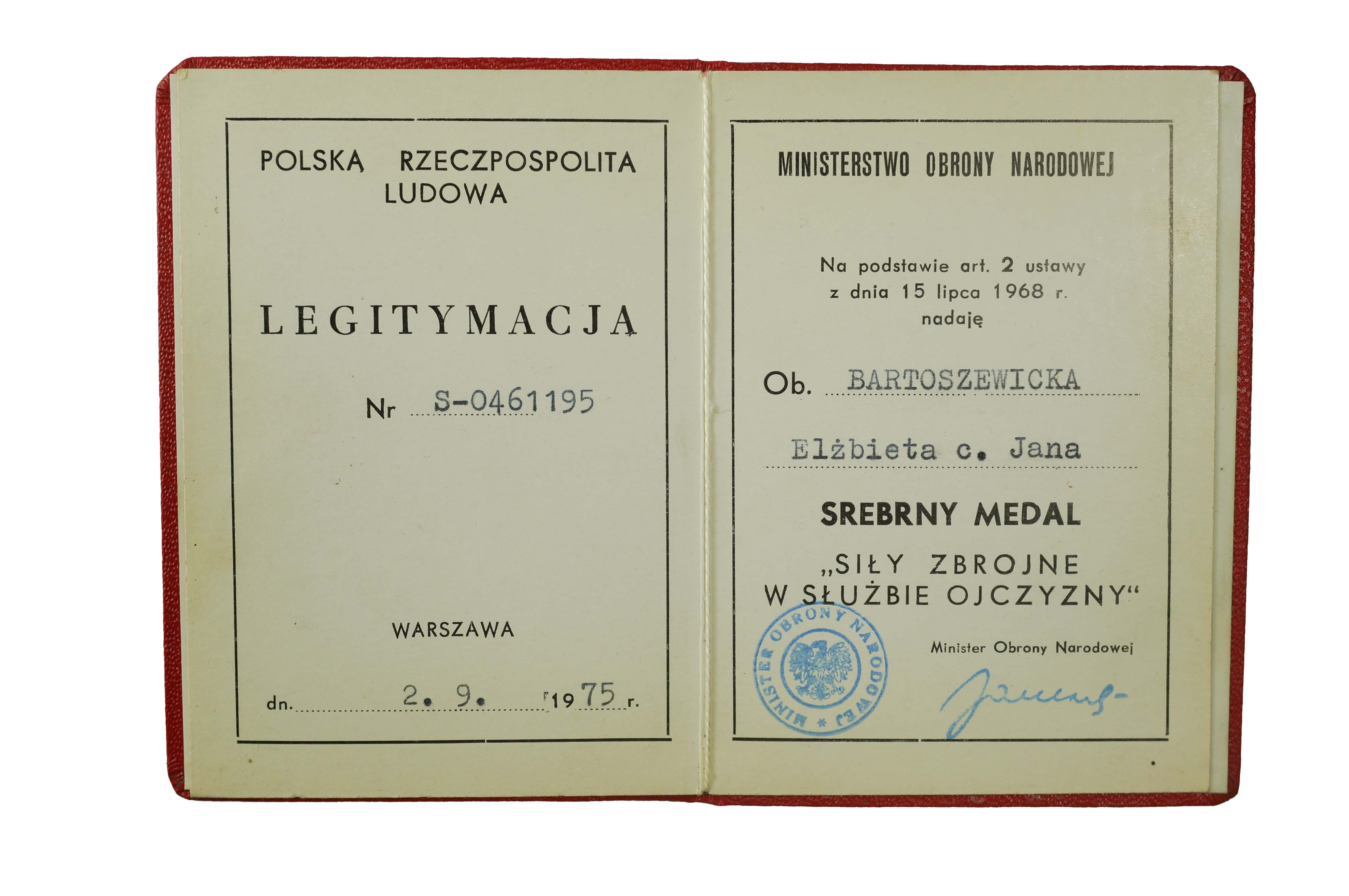 Legitymacja Srebrny Medal Siły Zbrojne w Służbie Ojczyzny [dla kobiety], datowana 2.9.1975r., f. 7,5x10,7cm