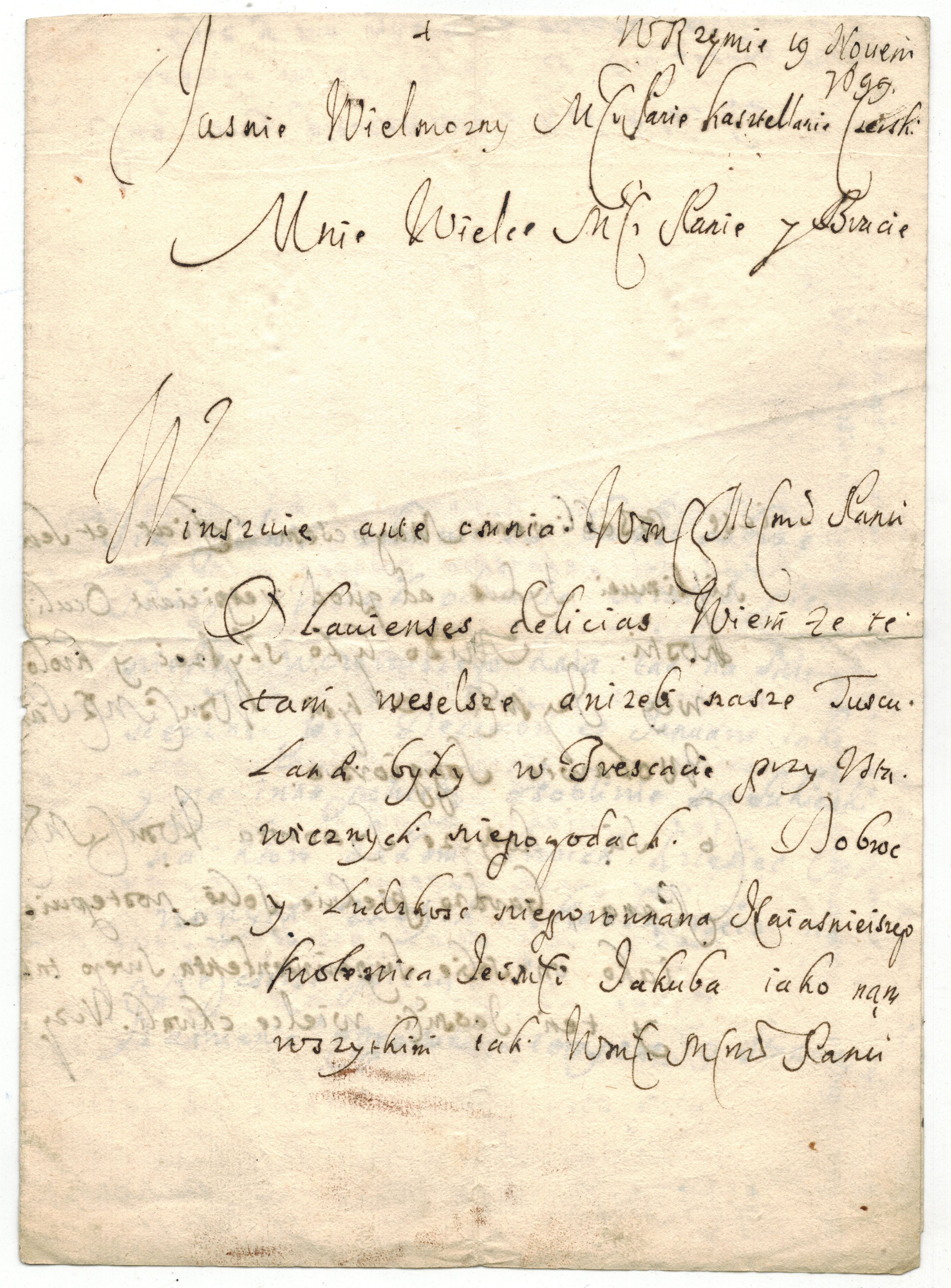 List odręczny, 4 str., na arkuszu 21,1 x 15,3 cm, treść w języku polskim, z okazjonalnymi wtrętami łacińskimi. Składa się z kilku osobnych zapisków, pierwszy z nich datowany: W Rzymie 19 Novem 1699, zaadresowany: Jasnie Wielmozny MCi Panie Kasztellanie Czerski Mnie Wielce MCi Panie y Bracie.