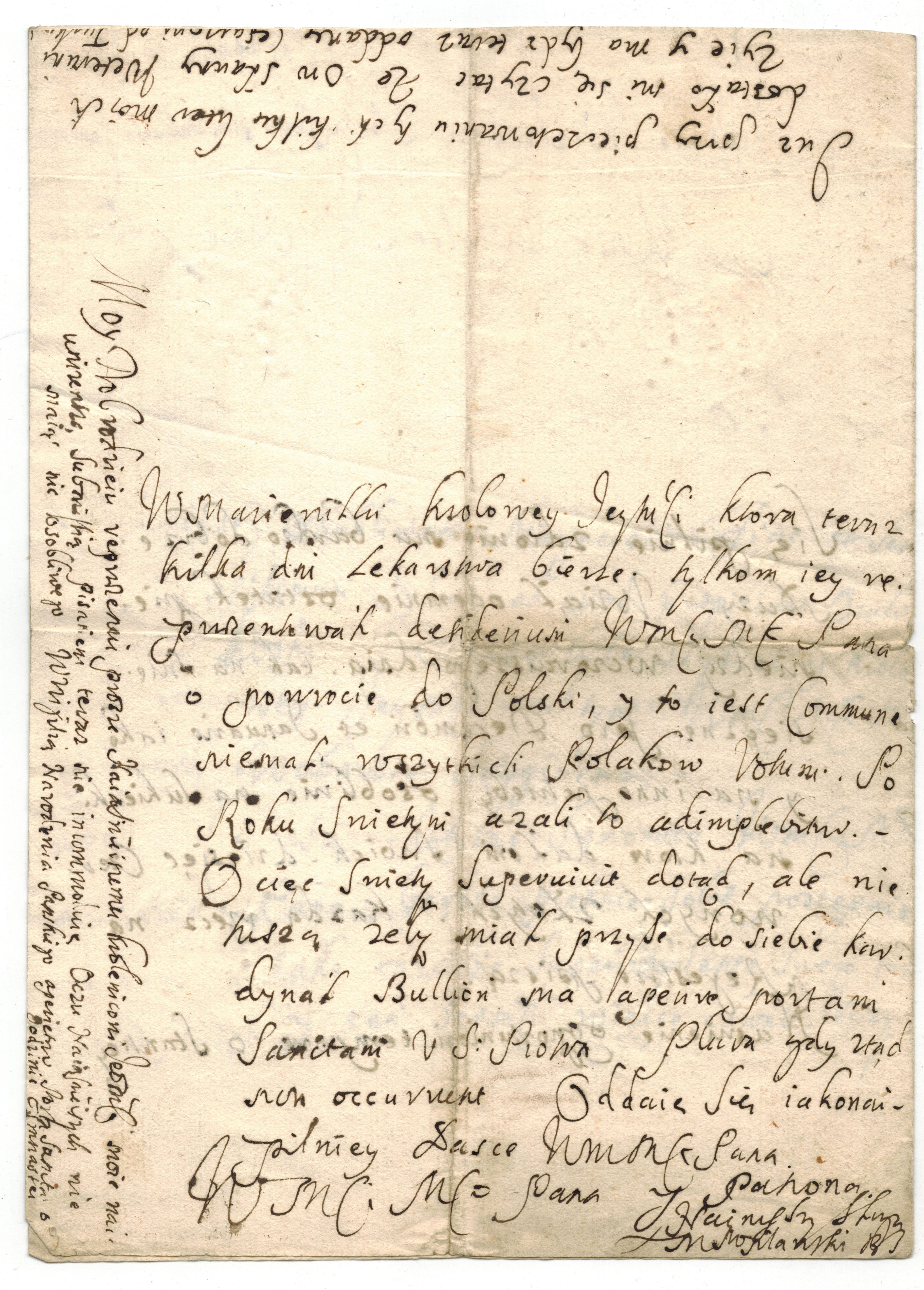 W pierwszym liście mowa o królewiczu Jakubie, w drugim komentuje „Miło było słyszeć y królowy Jej MCi o tym...”, a potem pisze „co się dotycze synowca Wm MCi Pana, bardzo pięknie sobie postępuje...Uczy się pilnie, zdrowie mu bardzo dobze. Duży wziął odemnie ostatek pieniędzy...” na ostatniej stronie 3 wpisy, w jednym z nich mowa o „królowey Jej MCi, która teraz kilka dni lekarstwa bierze”. Na dole 4 strony słabo czytelny podpis Uniżony Sługa MPopławski (?)