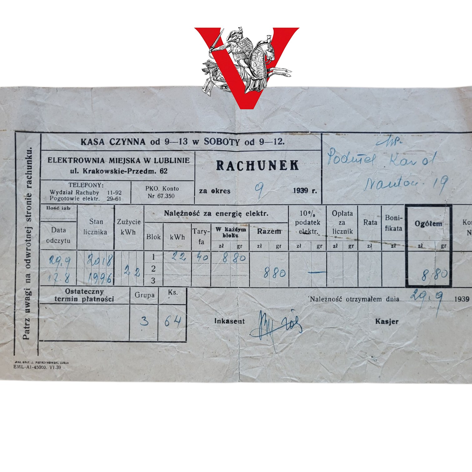 Ogromna ciekawostka, rachunek za prąd zapłacony jeszcze w czasie trwania walk we wrześniu 1939 roku.