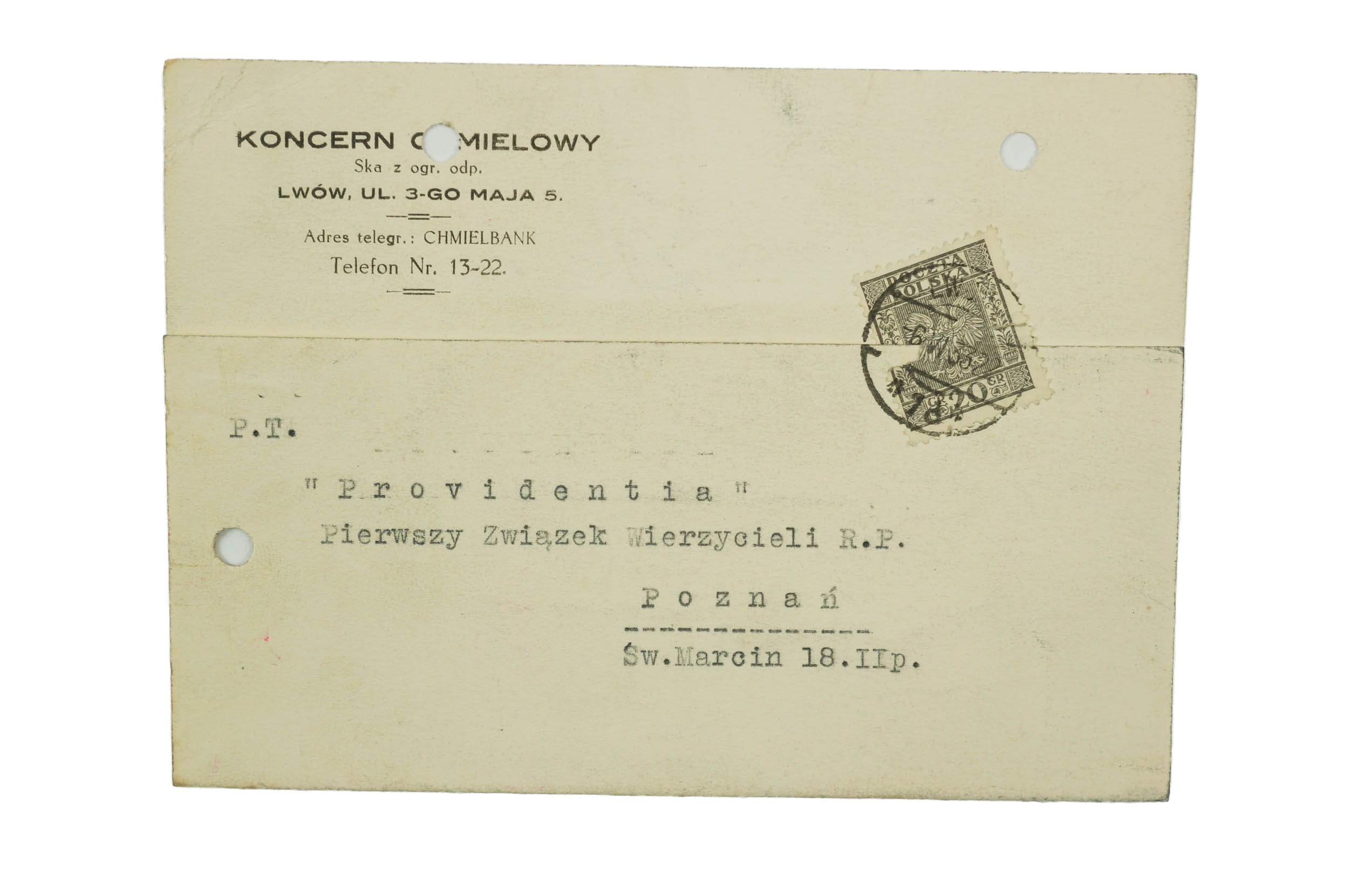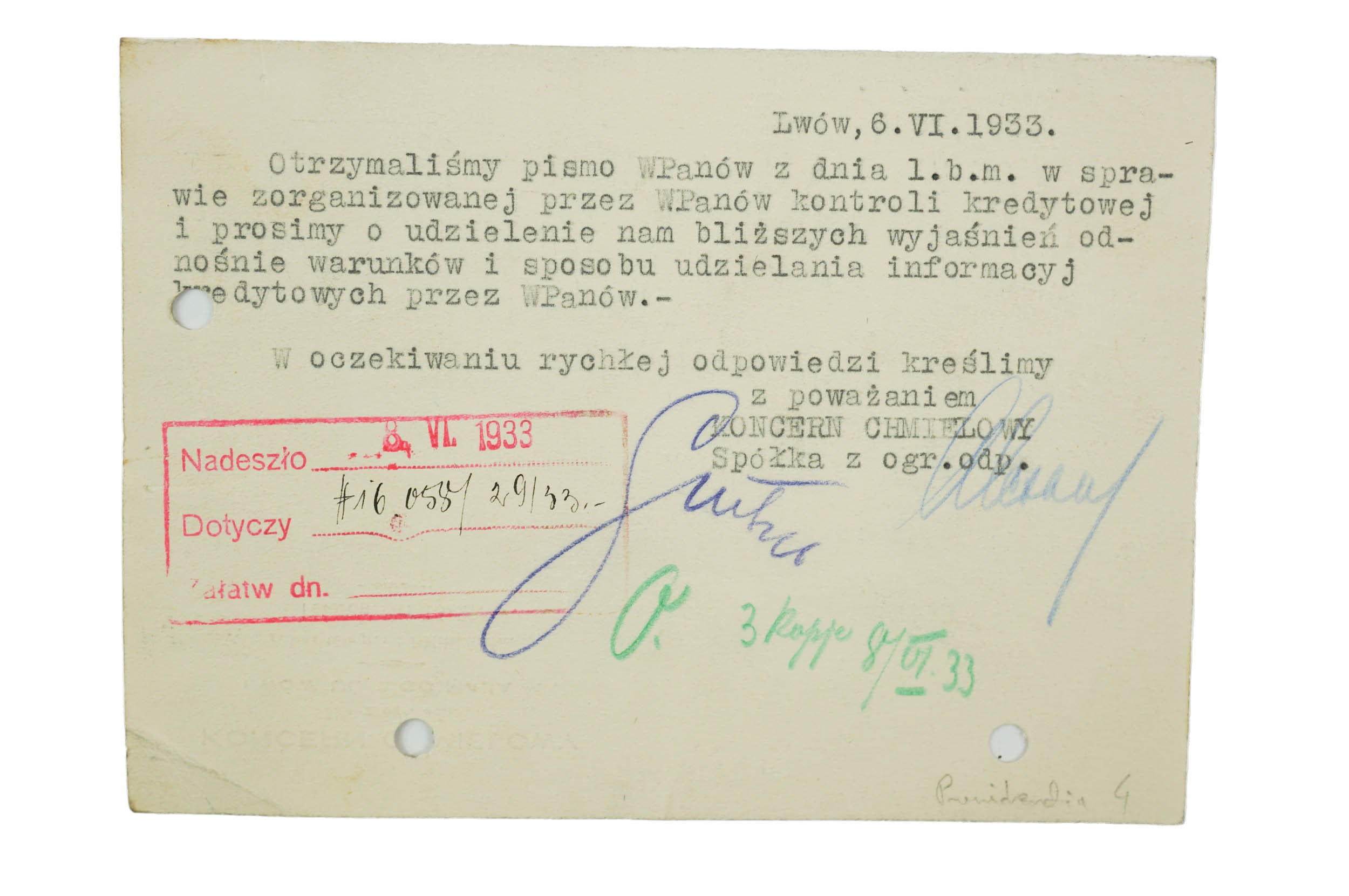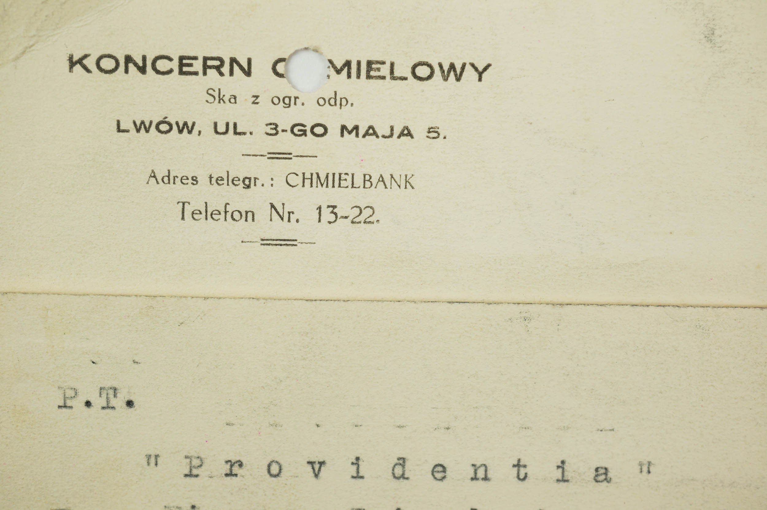 Koncern Chmielowy Sp. z o.o. Lwow ul. 3-go maja 5, KORESPONDENCJA z Pierwszym Związkiem Wierzycieli R.P. "Providentia", datowana 6.VI.1933r., maszynopis na druku z nagłówkiem firmowym, obieg pocztowy, f. 14,5 x 10,5cm, [AW1]
