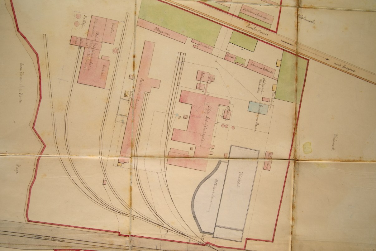 Rzadki plan z okresu początków istnienia Pierwszej Galicyjskiej Fabryki Sody Amoniakalnej S.A., zlokalizowanej na terenie Borku Fałęckiego w Krakowie.
