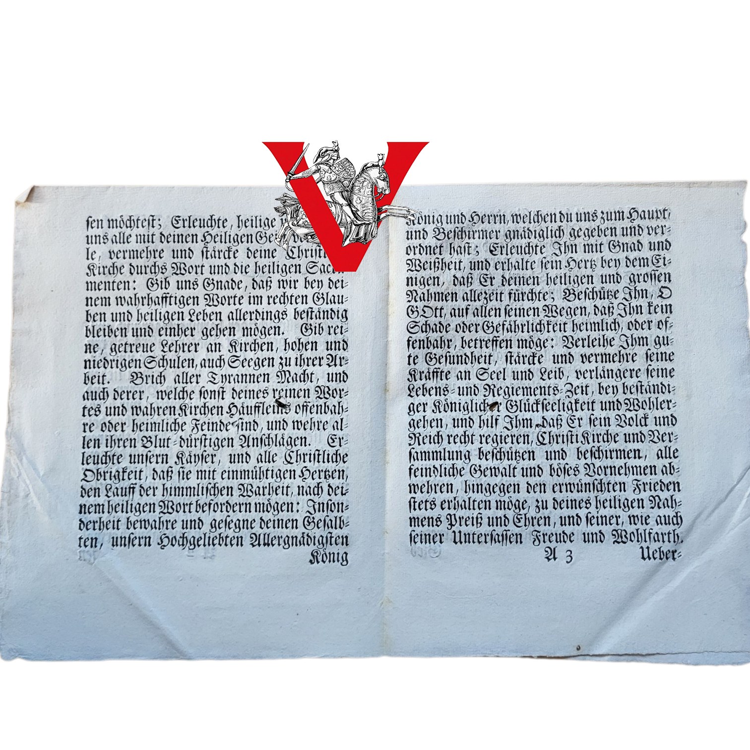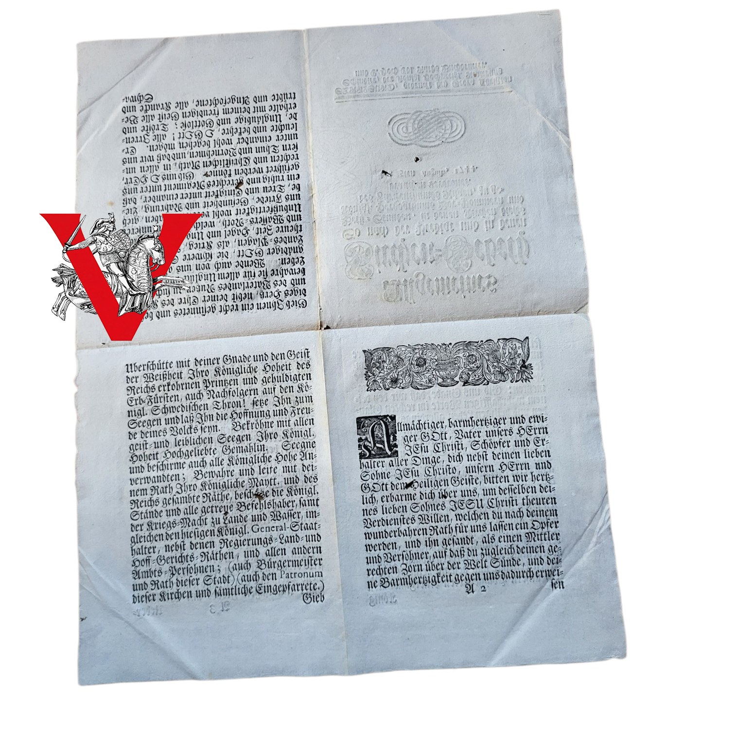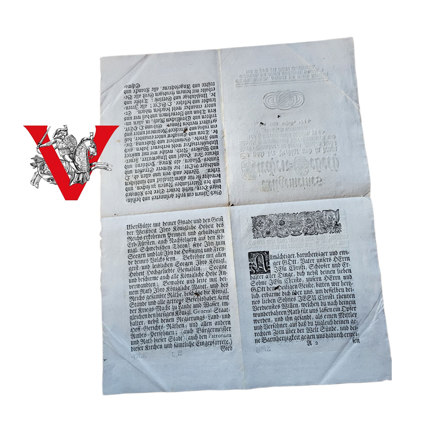 Oryginalny starodruk z XVIII wieku, wydany w 1744 roku w miejscowości Strzałów (Stralsund) na Pomorzu. Dokument zatytułowany „Allgemeines Kirchen-Gebeth” (Modlitwa kościelna powszechna) był przeznaczony do użytku w kościołach Księstwa Pomorza Przedniego i Księstwa Rugii.
