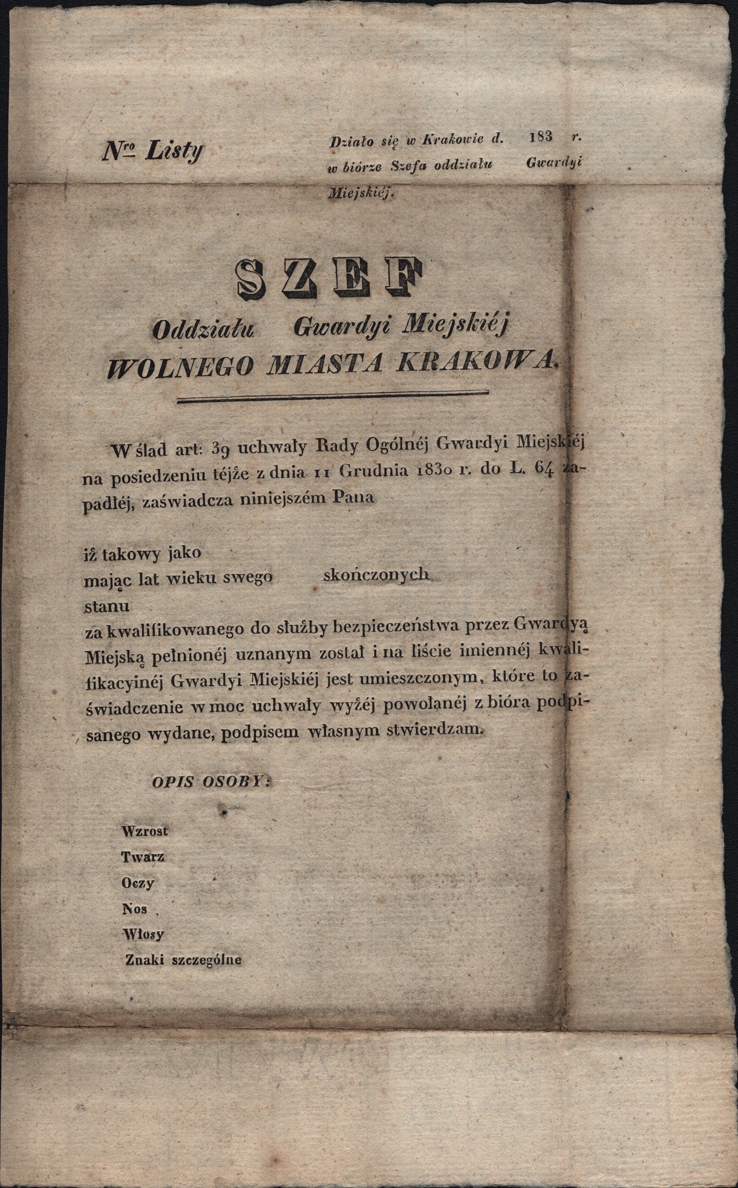 Powstanie Listopadowe] Szef Oddziału Gwardii Miejskiej Wolnego Miasta Krakowa. Czysty formularz zaświadczenia o zakwalifikowaniu do służby bezpieczeństwa [po XII 1830 r.]