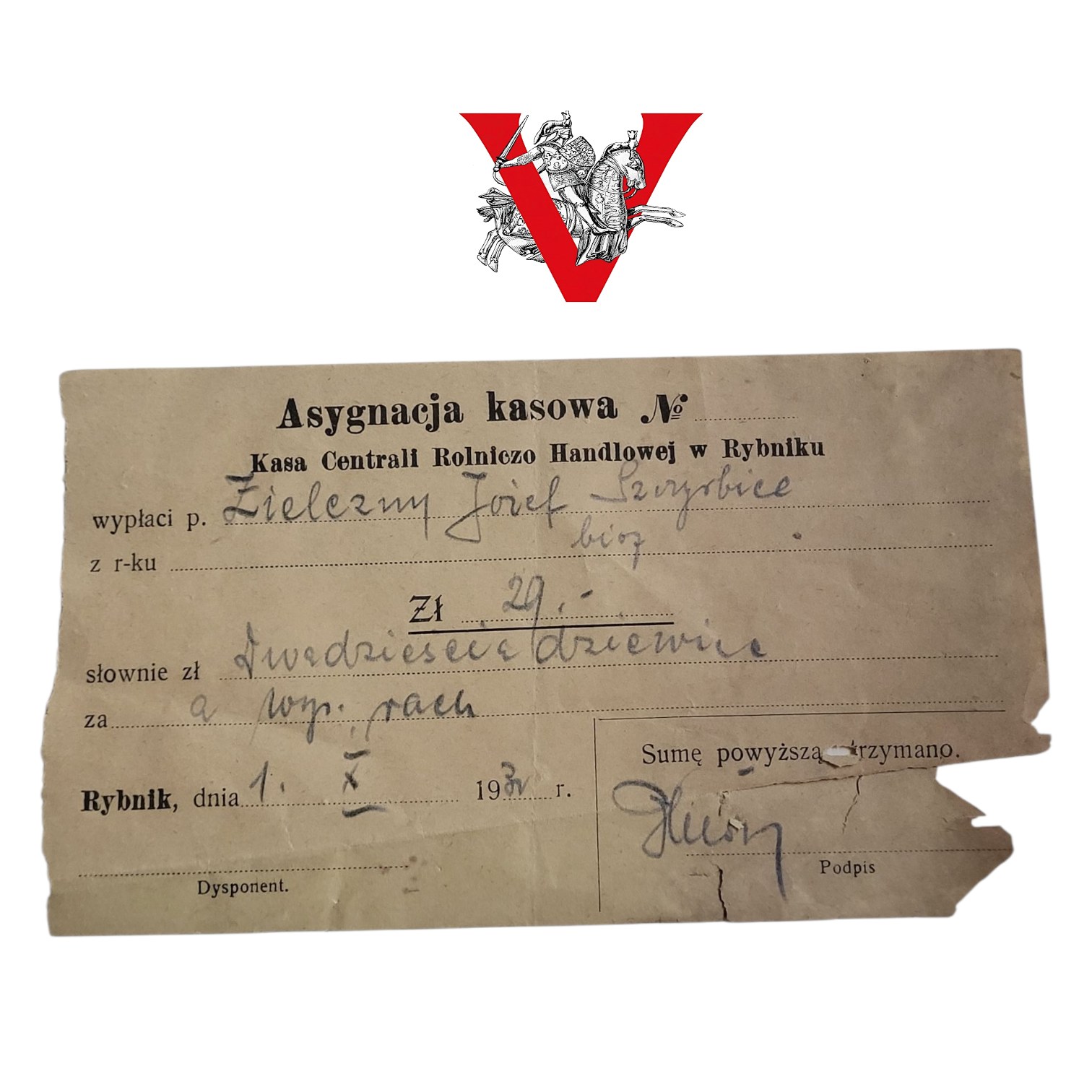 Historyczny dokument finansowy wystawiony przez Kasę Centrali Rolniczo Handlowej w Rybnik