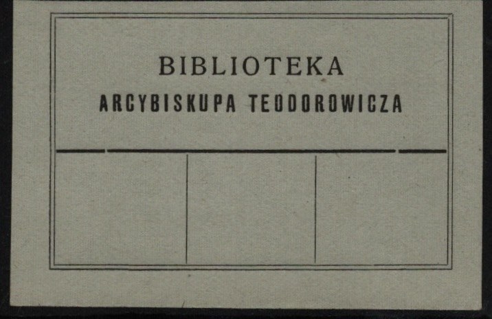 1. Nalepka inwentarzowa "Biblioteka Arcybiskupa Teodorowicza". Wym. 5,6 x 3,8 cm.