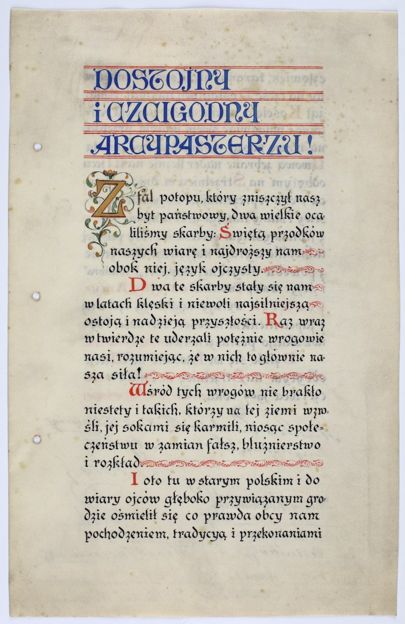 Adres przygotowany w formie rękopisu iluminowanego na pergaminie o wym. 33 x 21 cm. Na lewym marg. ślady po dziurkach (zapewne od pierwotnie przygotowanej teki do adresu), drobny foxing na górnym marginesie