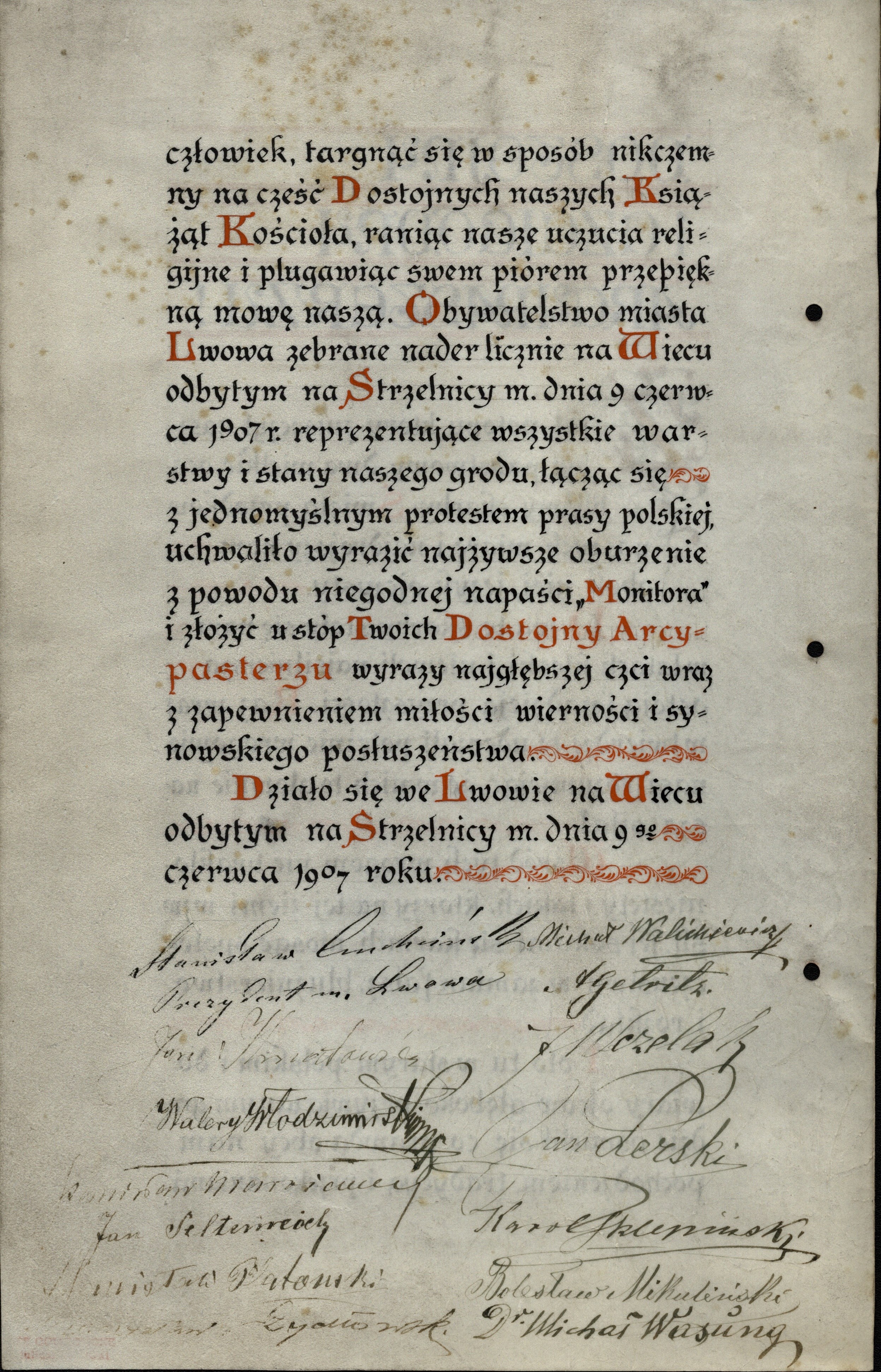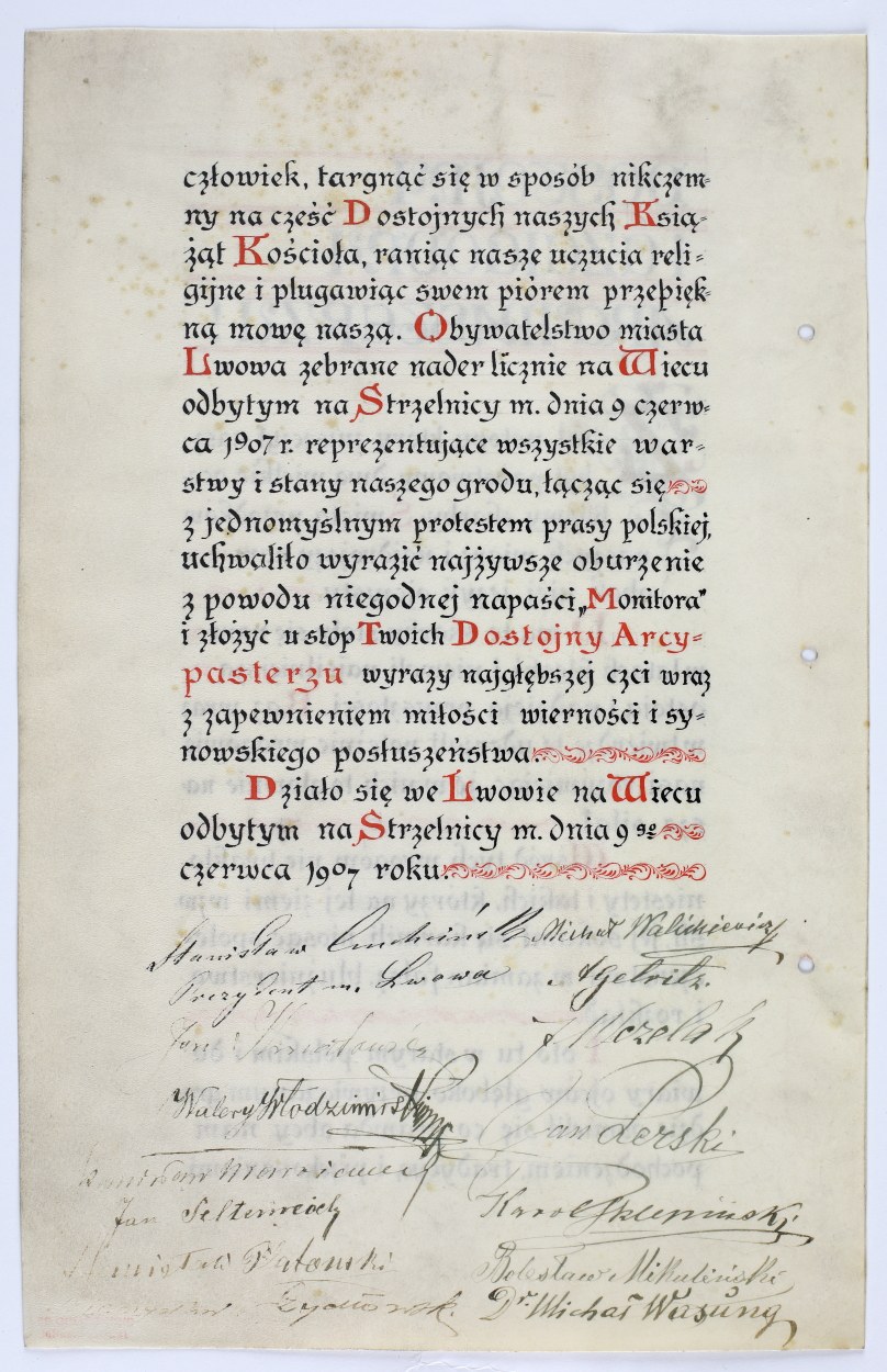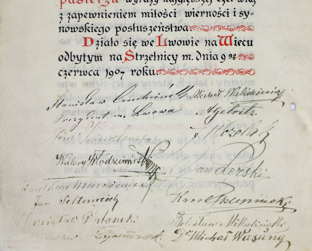 U dołu podpisy Stanisława Ciuchcińskiego (1841-1912), prezydenta miasta Lwowa, Jana Ihnatowicza (1848-1918) lwowskiego przemysłowca, twórcy fabryki kosmetyków w Galicji, Aleksandra Getritza, lwowskiego introligatora, Michała Wasunga, lwowskiego adwokata oraz innych obywateli miasta Lwowa.