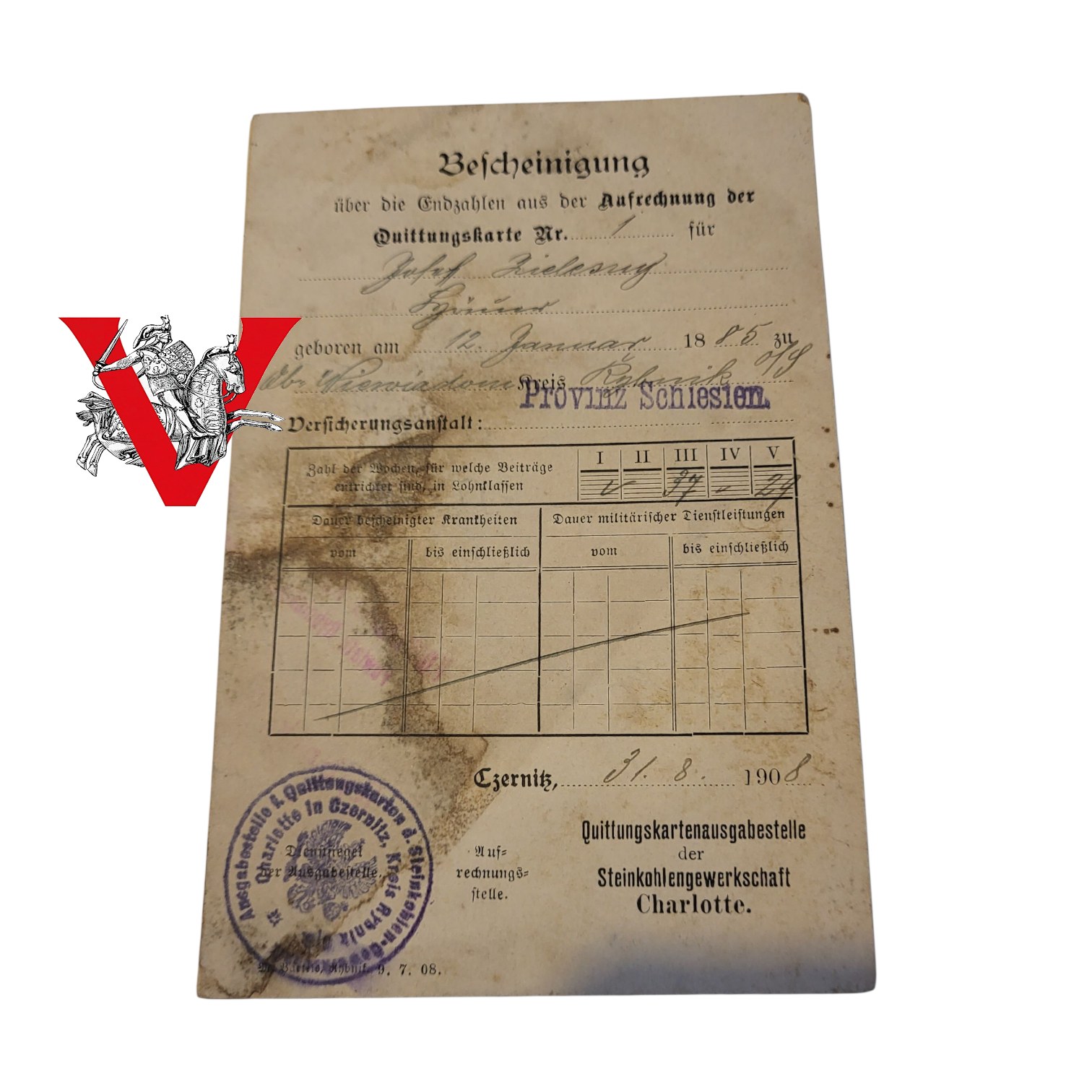 Oryginalny dokument urzędowy z początku XX wieku, wystawiony 11 sierpnia 1908 roku przez Steinkohlengrwerkschaft Charlotte – Związek Górniczy Kopalni Węgla Kamiennego „Charlotte” działający w miejscowości Czernitz (Czarńce) na terenie Prowincji Śląsk (Provinz Schlesien).