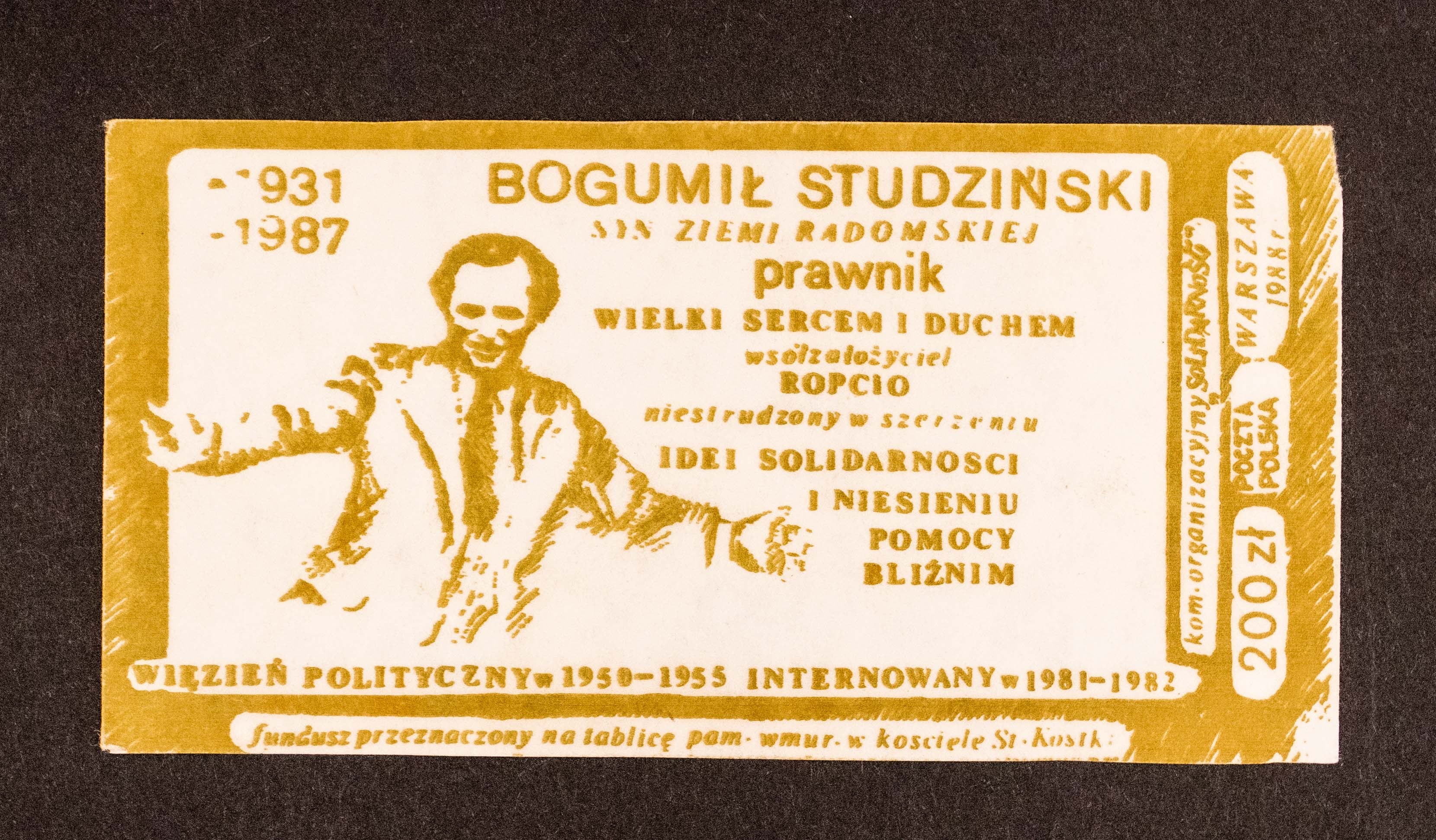 SOLIDARNOŚĆ, cegiełka 200 zł, pamięci Bogumiła Studzińskiego zmarłego w 1987 roku, przeznaczona na tablice pamiątkowa w kościele Stanisława Kostki, Radom 1988. Kolor żółty.
