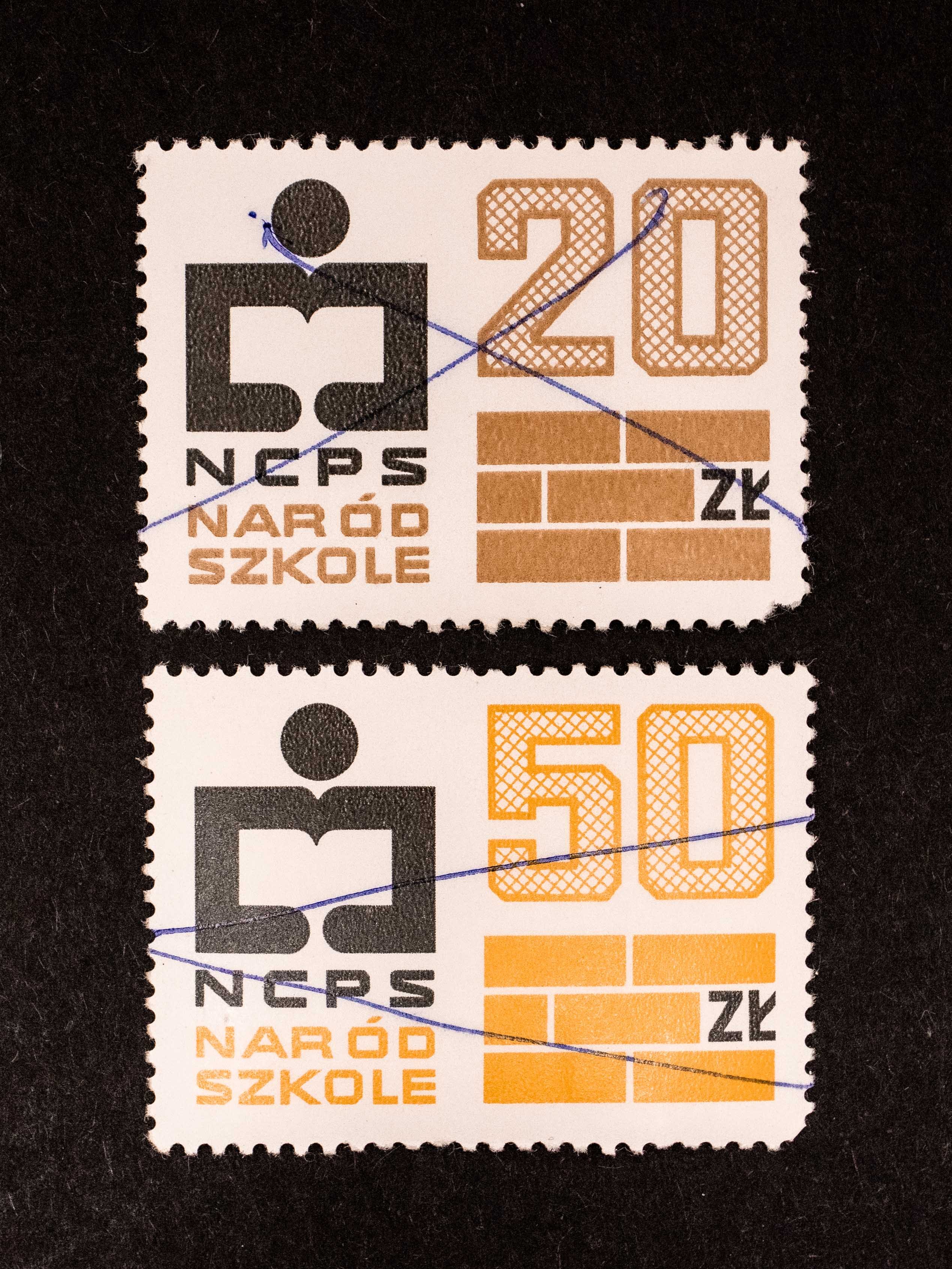Cegiełki pokreślone długopisem. Wymiary 4,5cm x 3cm.