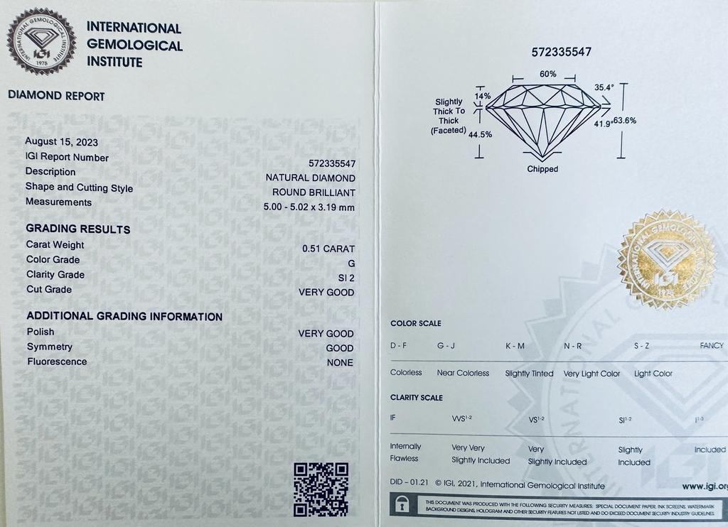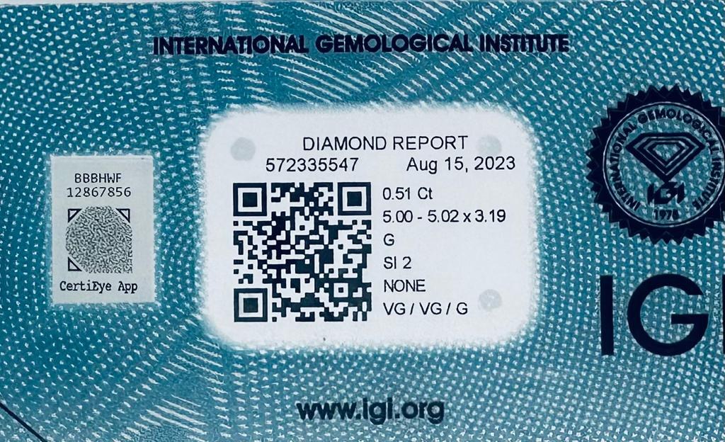 DIAMOND 0.51 CT G - SI2 - IGI - SF30804
