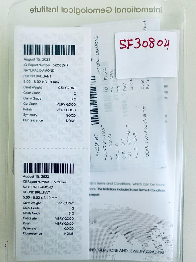 DIAMOND 0.51 CARATS COLOR G - CLARITY SI2 - BRILLIANT CUT - IGI CERTIFICATE - CLARITY SF30804