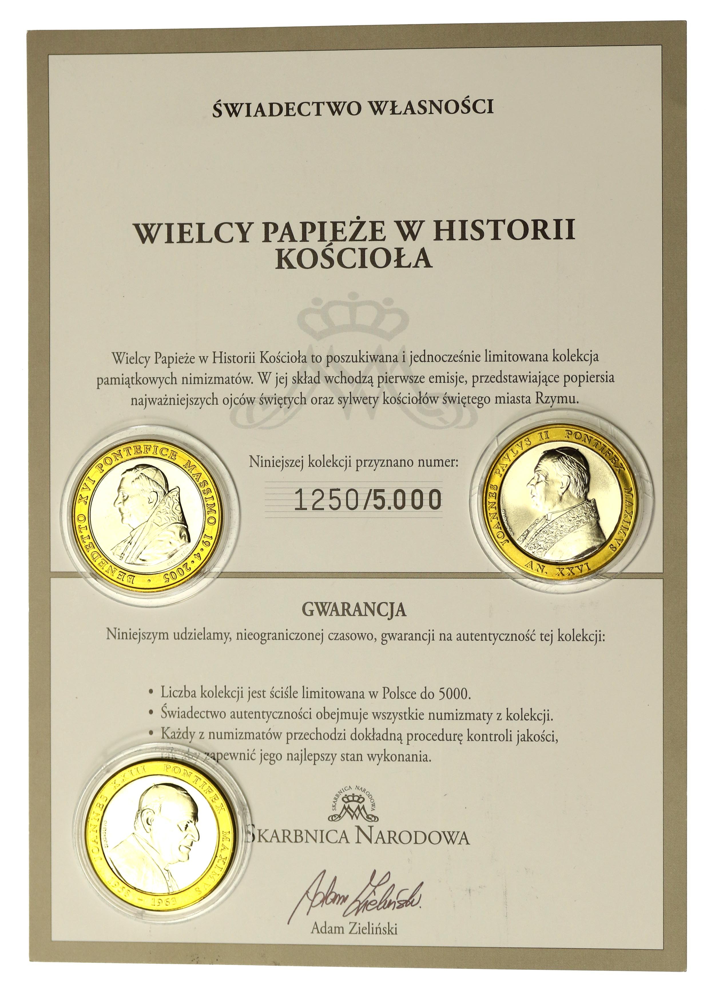 III RP, zestaw medali Wielcy Papieże - 3 szt. wraz z certyfikatem. Medale z serii poświęconej Wielkim Papieżom emisji Skarbnicy Narodowej.