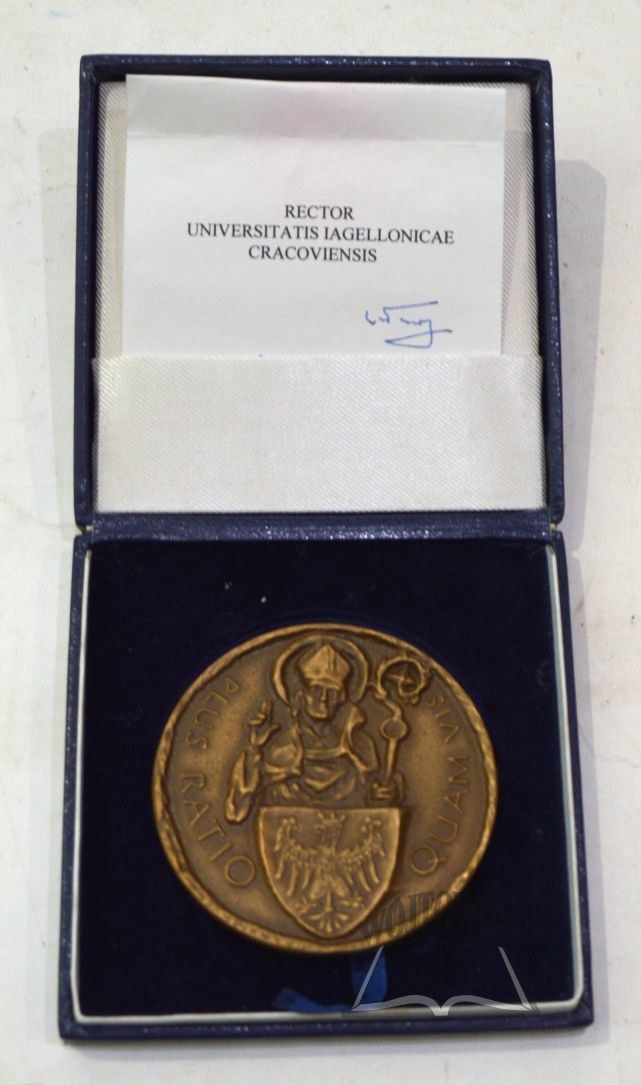 Brąz; średnica: 68 mm. Medal w dedykowanym etui wraz z dołączonym dokumentem z podpisem rektora UJ z datą 25.06.1998 r.