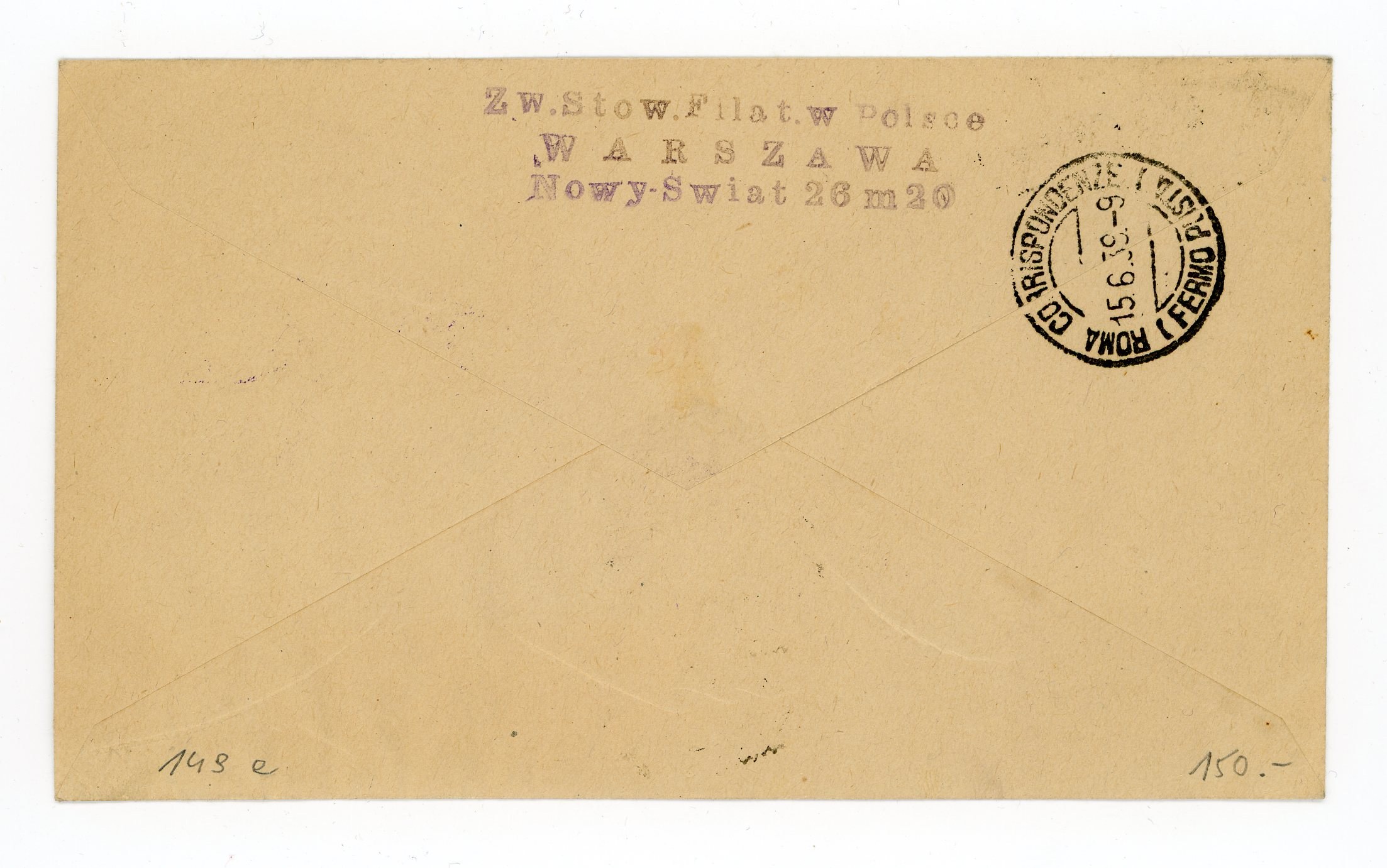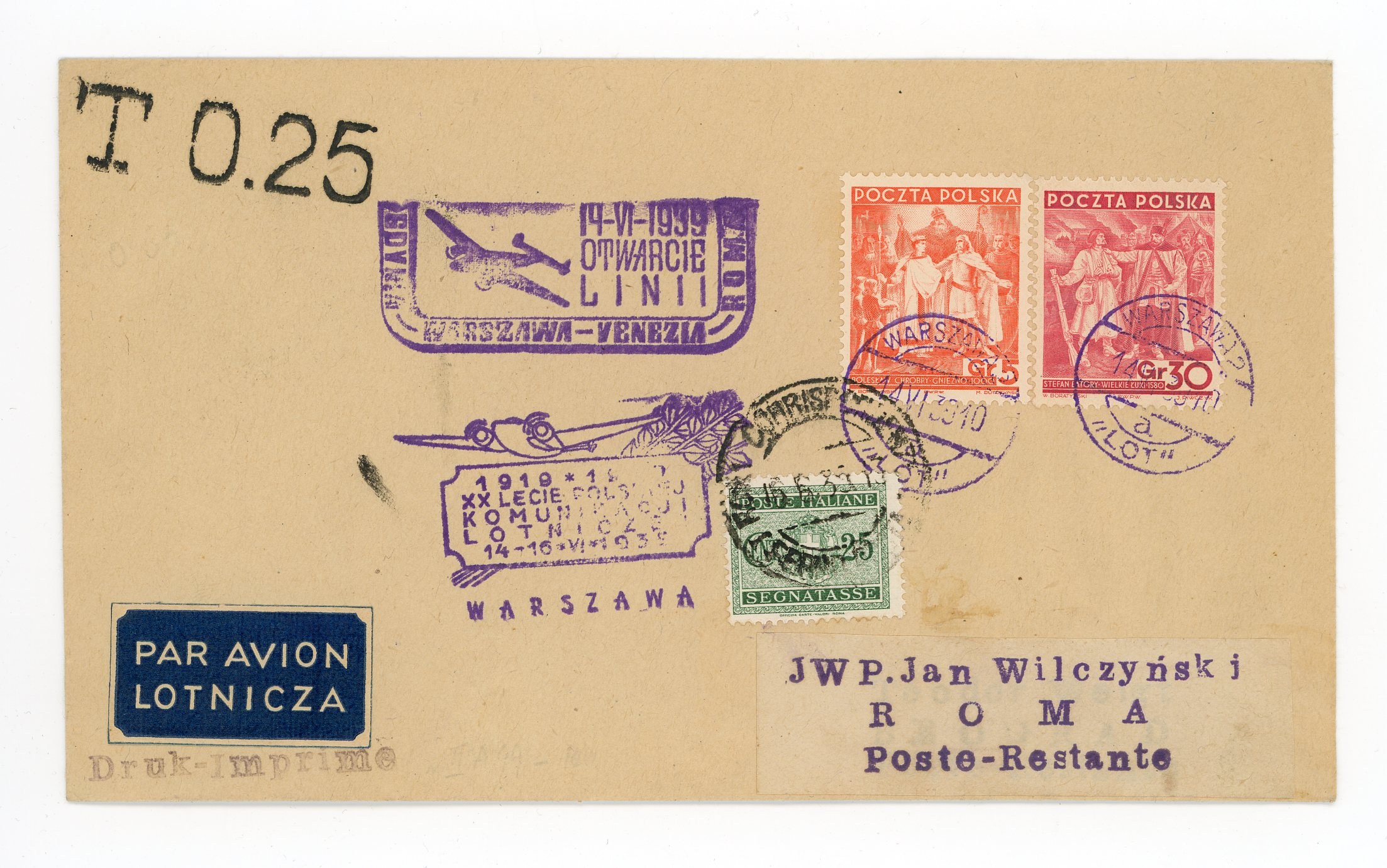 Otwarcie linii lotniczej na trasie Gdynia - Warszawa - Wenecja - Rzym, list lotniczy wysłany 14.6.39 z Warszawy do Rzymu; dodatkowe stempelki: "14-VI-1939 OTWARCIE LINII GDYNIA-WARSZAWA-WENECJA-RZYM" oraz "1919-1939 XX LECIE POLSKIEJ KOMUNIKACJI LOTNICZEJ 14-16.VI.1939 GDYNIA"; datownik odbiorczy na odwrocie.