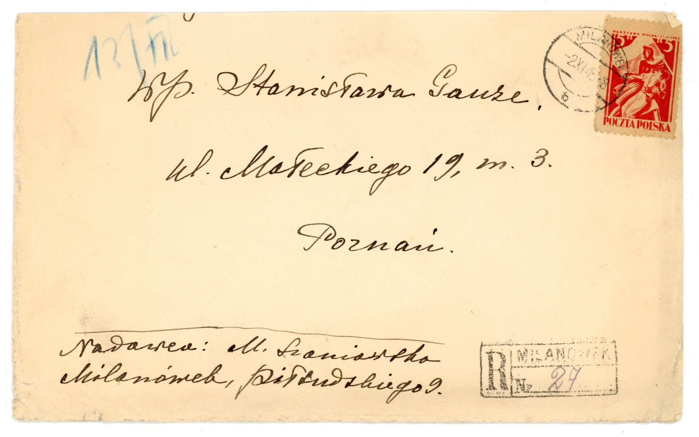 Wydanie łódzkie, list polecony z Milanówka do Poznania 2.XI.45