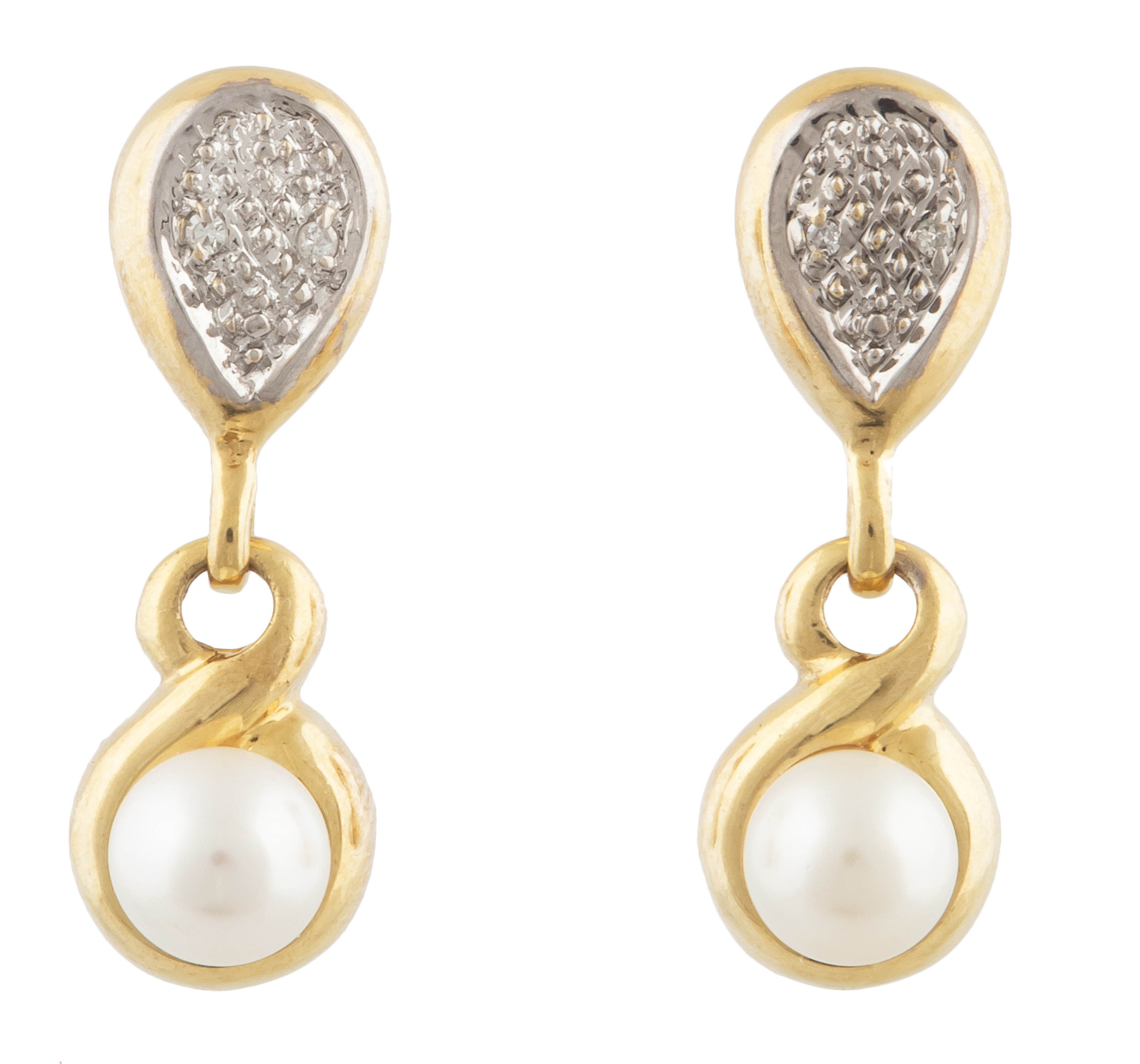 złoto, pr. 0,585, m. 4,92 g, 4 szt. diamentów w szlifie 8/8 łącznie ok. 0,02 ct, perły hodowane śr. ok. 5,30 - 5,50 mm