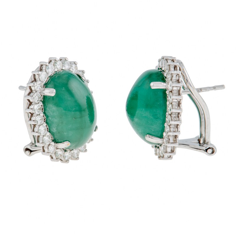 białe złoto pr. ~ 0,750, rodowane, 2 szt. szmaragdów w szlifie kaboszon ł. ~ 17,90 ct, 46 szt. brylantów ł. ~ 1,25 ct H/Si, masa: 11,90 g; wym.: 2 x 1,6 cm