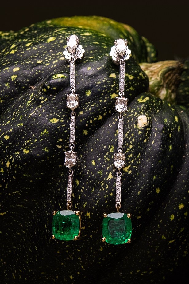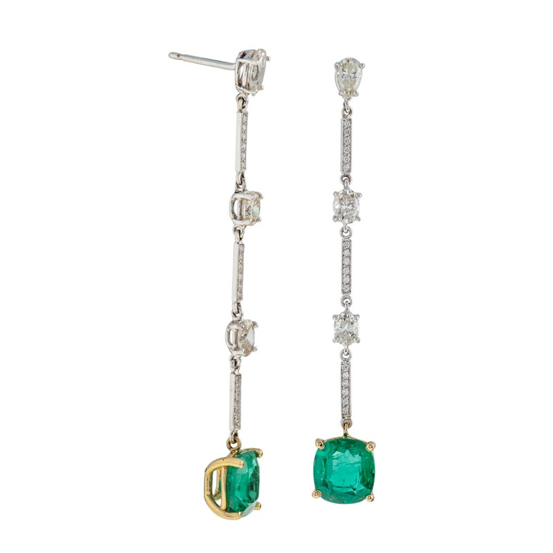 białe złoto pr. ~ 0,750, rodowane, żółte złoto, 2 szt. szmaragdów (Zambia) w szlifie cushion ł. ~ 5,50 ct, 4 szt. diamentów w szlifie owalnym ł. ~ 1,13 ct K-L/Si-P1, 2 szt. diamentów w formie kropli ł. ~ 0,75 ct J-L/Si, 36 szt. brylantów ł. ~ 0,14 ct H/Si, masa: 7,56 g; wym.: 6,5 x 0,9 cm