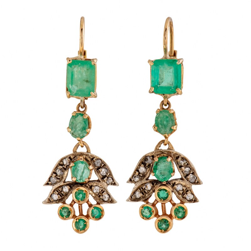 złoto pr. ~ 0,750, srebro, 2 szt. szmaragdów ł. ~1,89 ct, 4 szt. szmaragdów ł. ~ 0,80 ct, 8 szt. szmaragdów ł. ~ 0,27 ct, rozety diamentowe, masa: 7,18 g; wym.: 4,2 x 1,5 cm