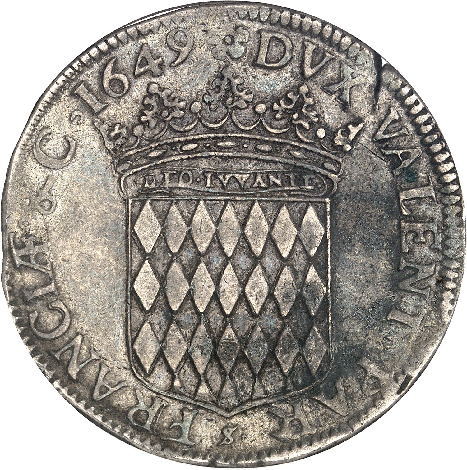 Rv. DVX° VALENT° PAR (différent) FRANCIư &C° (date). Écu des Grimaldi surmonté d’une couronne ducale avec la mention DEO IVVANTE.