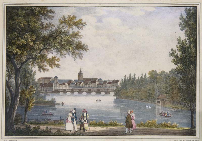 KRÓLEWIEC. Staw zamkowy, w oddali widoczne zabudowania miejskie, lit. O. Hermann, Lith. Ist. v. L. Sachse & Co., Berlin, ok. 1830; lit. kolor., st. bdb.; wymiary widoku: 293x195 mm; ANSICHT DES SCHLOSSTEICHS IN KÖNIGSBERG I P.;