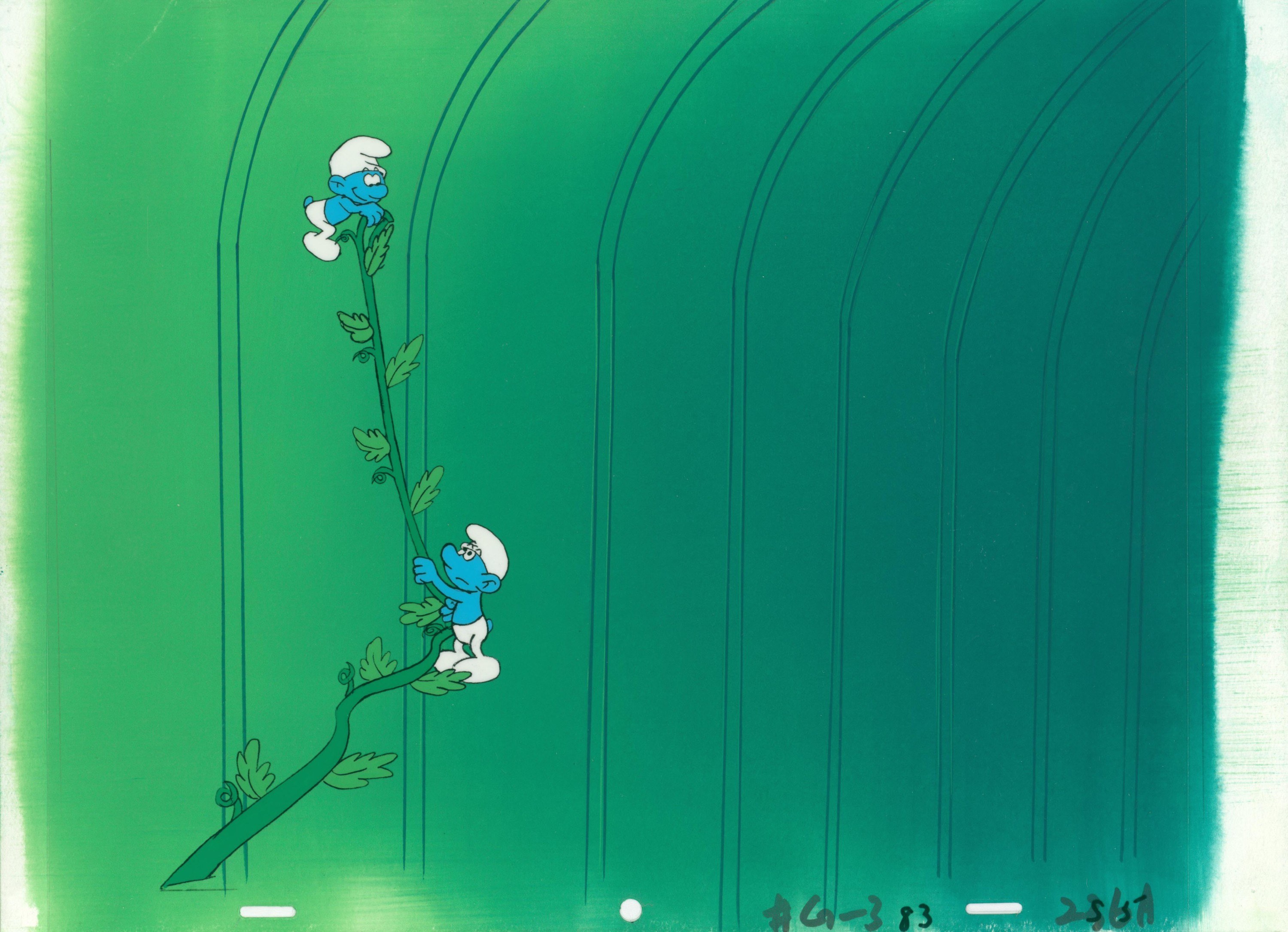 Zestaw oryginalnych prac składający się z ręcznie malowanej folii animacyjnej oraz ręcznie malowanego tła do wyjątkowo popularnej w latach 80. XX wieku produkcji pt. „The Smurfs” (1981-1989), według konceptu Peyo. Tło pochodzi najprawdopodobniej z innej produkcji. Praca przedstawia tytułowe Smerfy.
