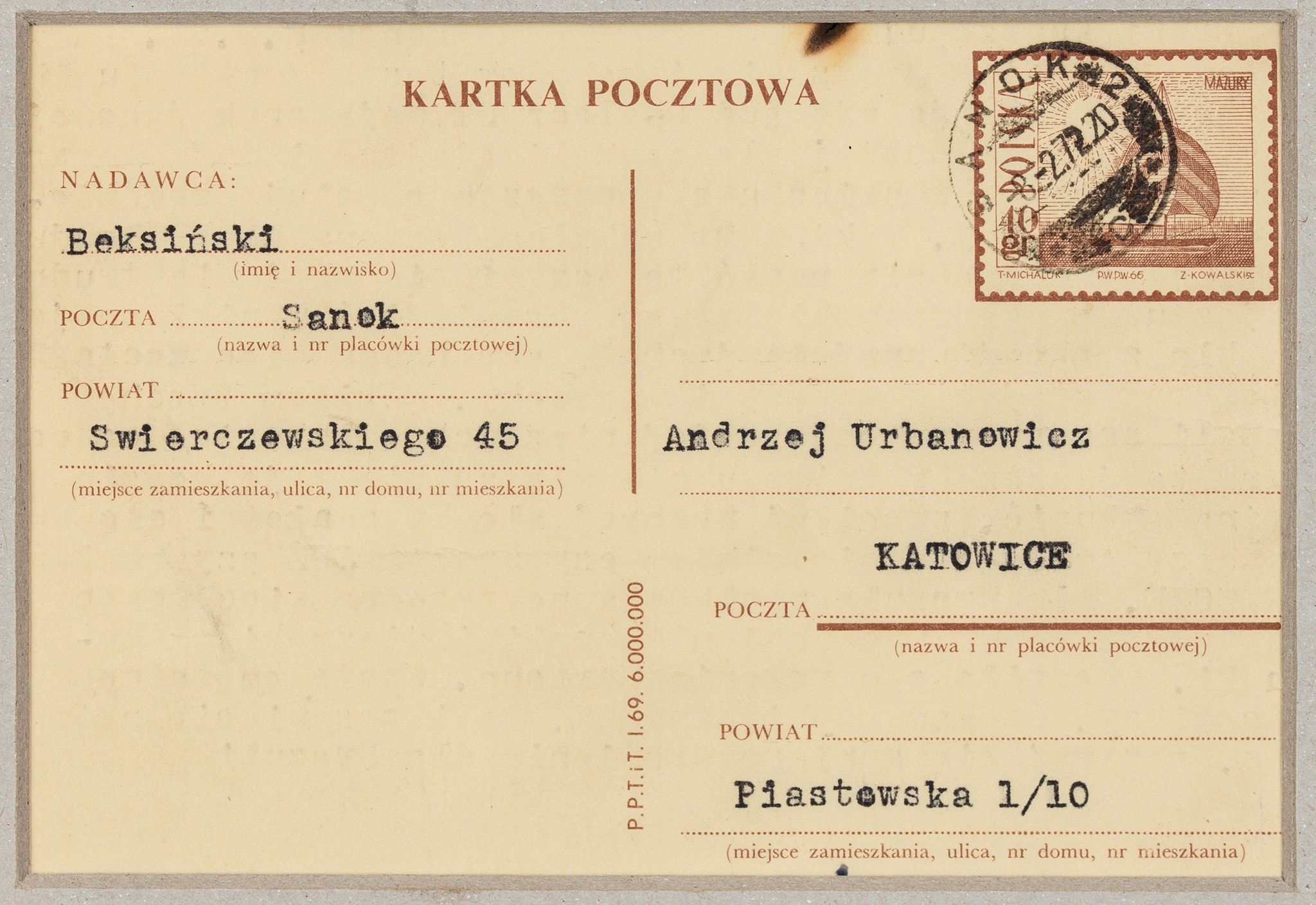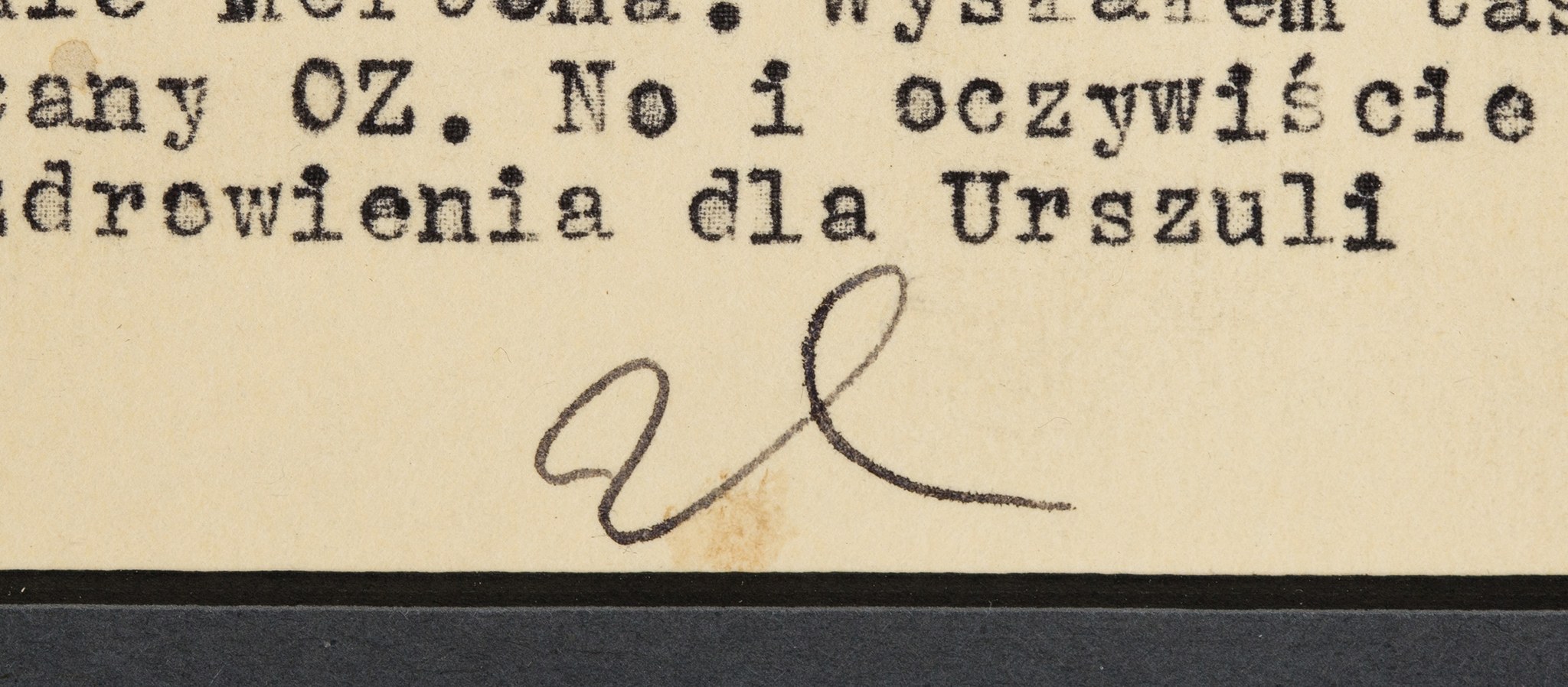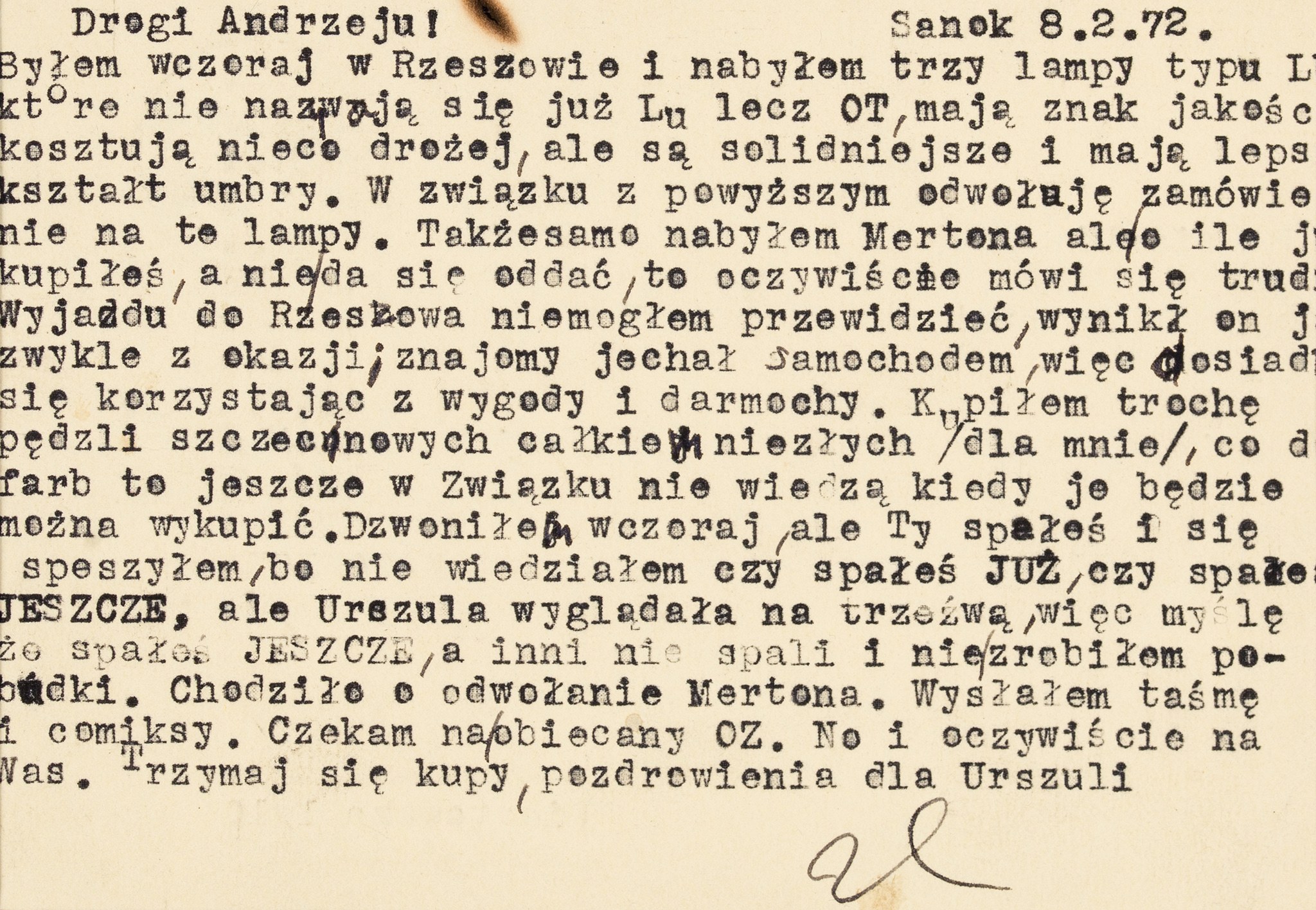 U dołu karta pocztowa z 8 lutego 1972 roku z maszynopisem, sygnowana monogramem wiązanym używanym w korespondencji z bliskimi: "ZB".