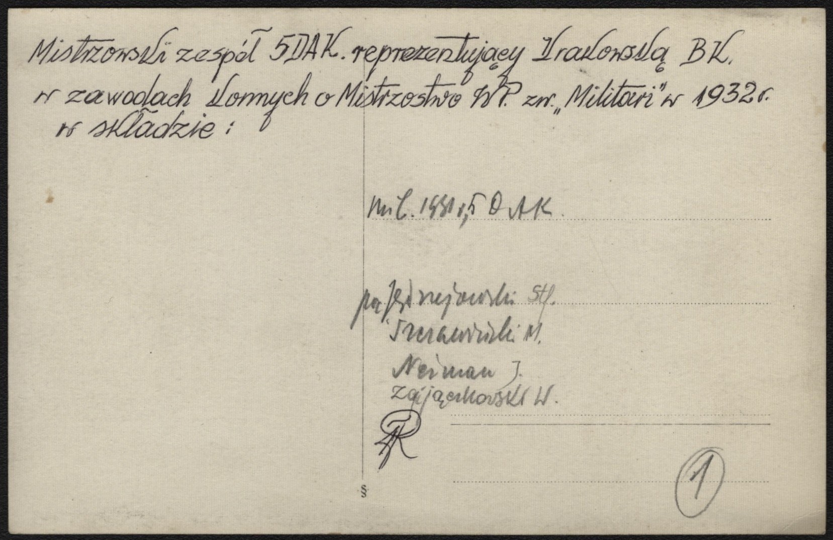 5 Dywizjon Artylerii Konnej] [Mistrzowski zespół 5DAK. reprezentujący Krakowską BK. w zawodach Konnych o Mistrzostwo WP. zw. "Militari" w 1932 r. W składzie: Jędrzejewski, Szumiński, Neiman, Zajączkowski.