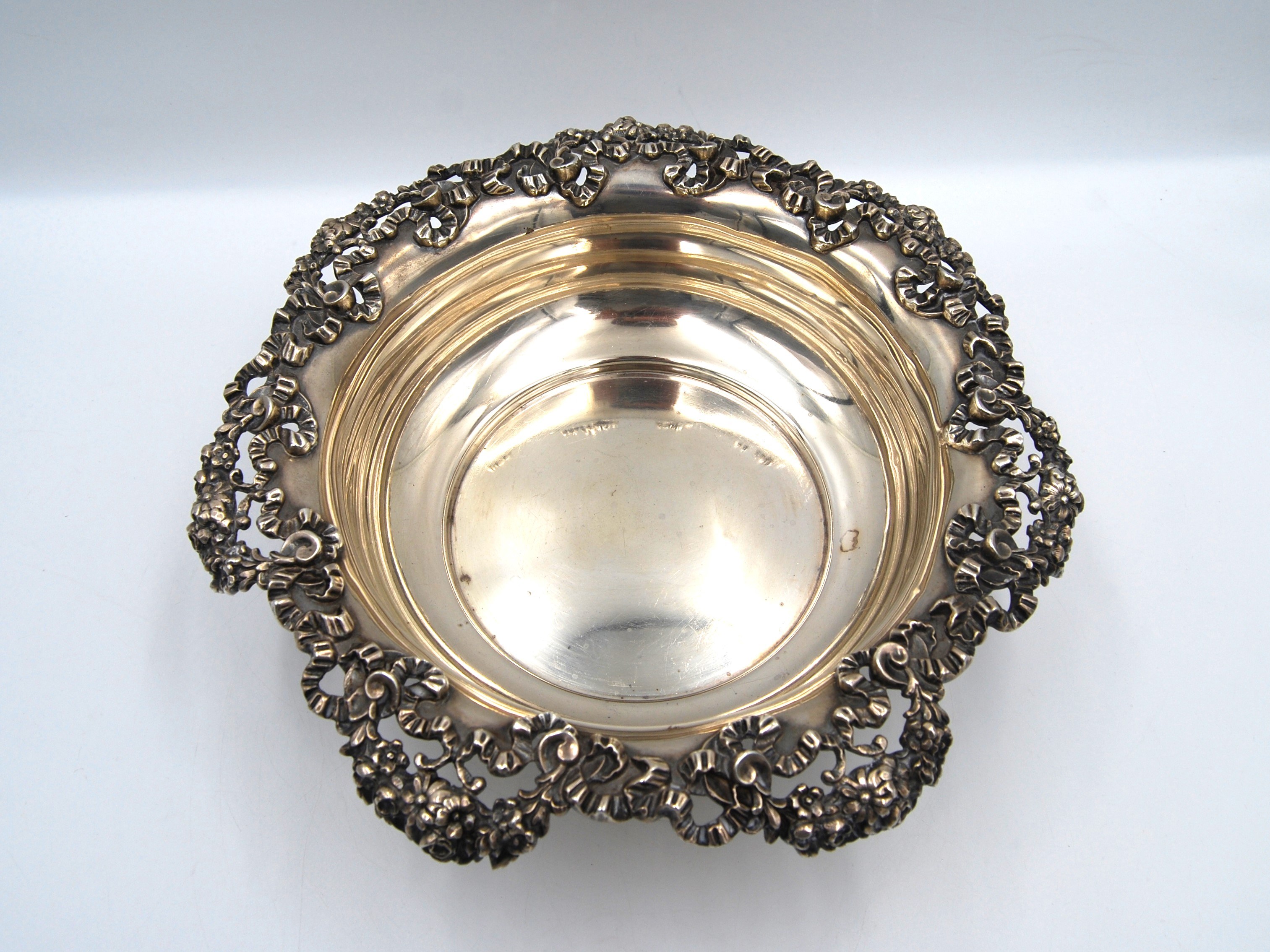 Masywna, duża głęboka misa z ażurową dekoracją z motywami kwiatowymi.