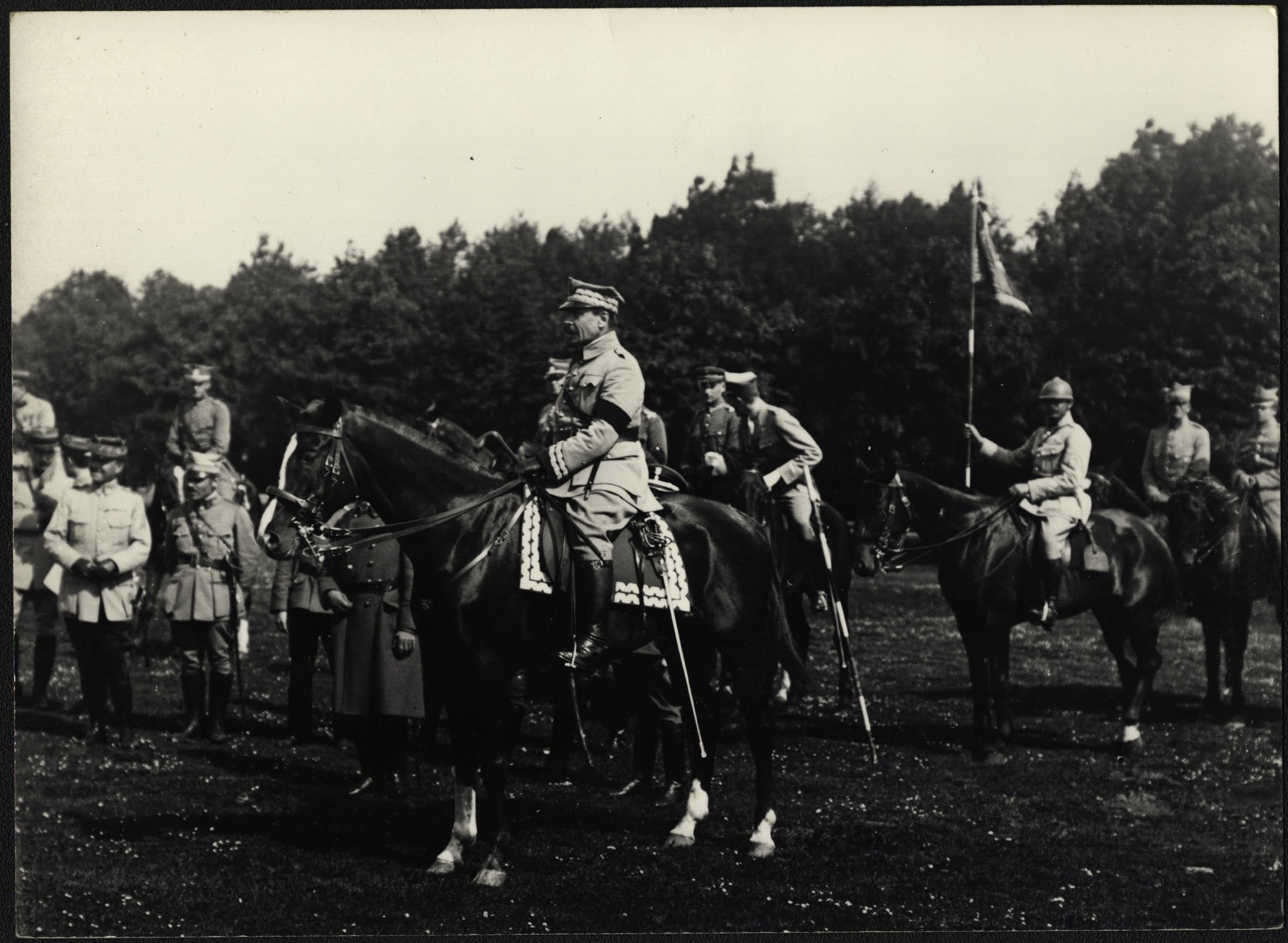 Zestaw 10 fotografii prezentujących oddziały Błękitnej Armii gen. Józefa Hallera wraz z samym Generałem, a także różne uroczystości z udziałem dowództwa Wojska Polskiego. Odbitki powojenne, na papierze błyszczącym, z oryginalnych klisz. Wymiary różne, dokładna specyfikacja poniżej. Drobne zapiski długopisem oraz ołówkiem na rewersach.