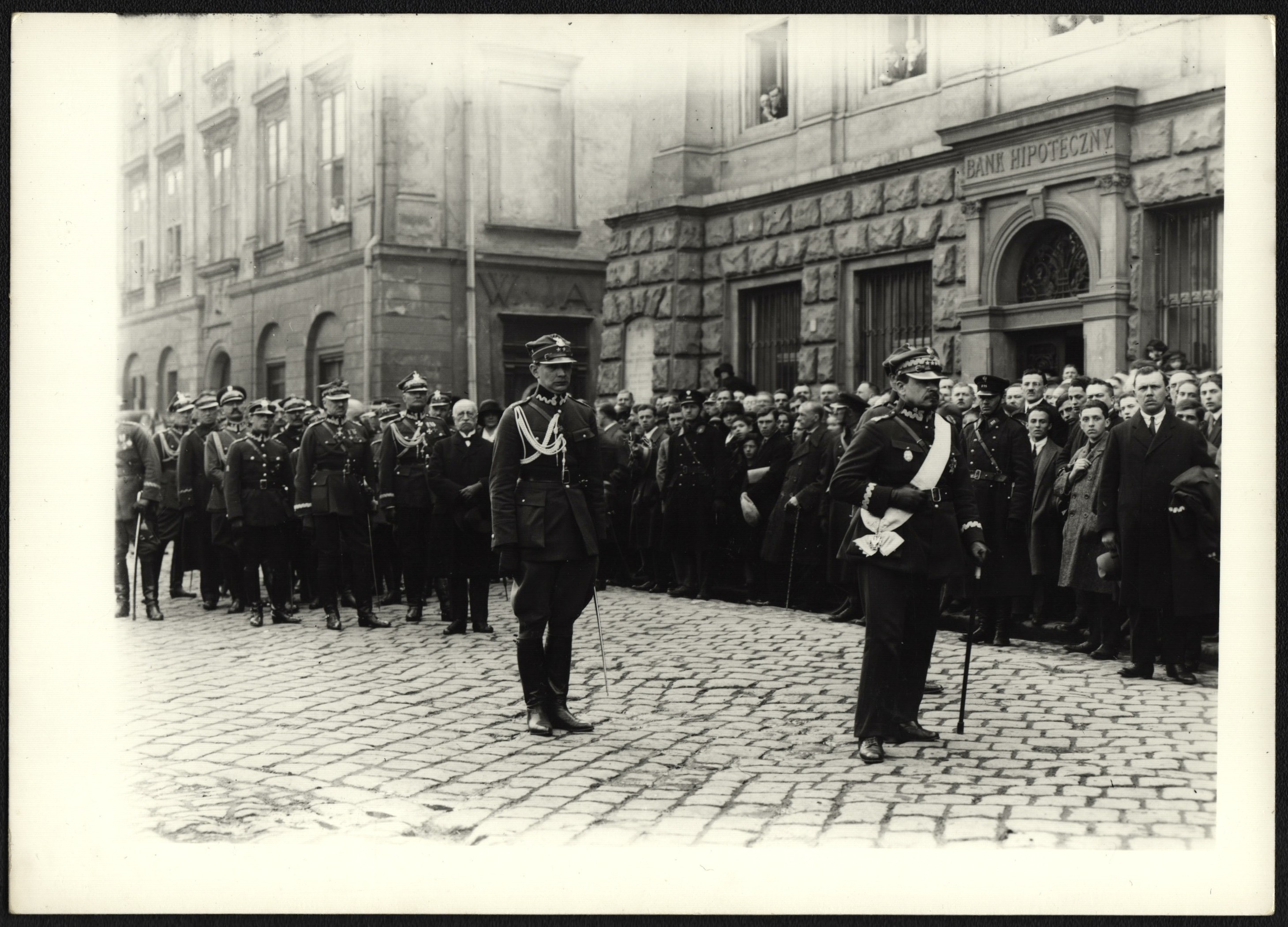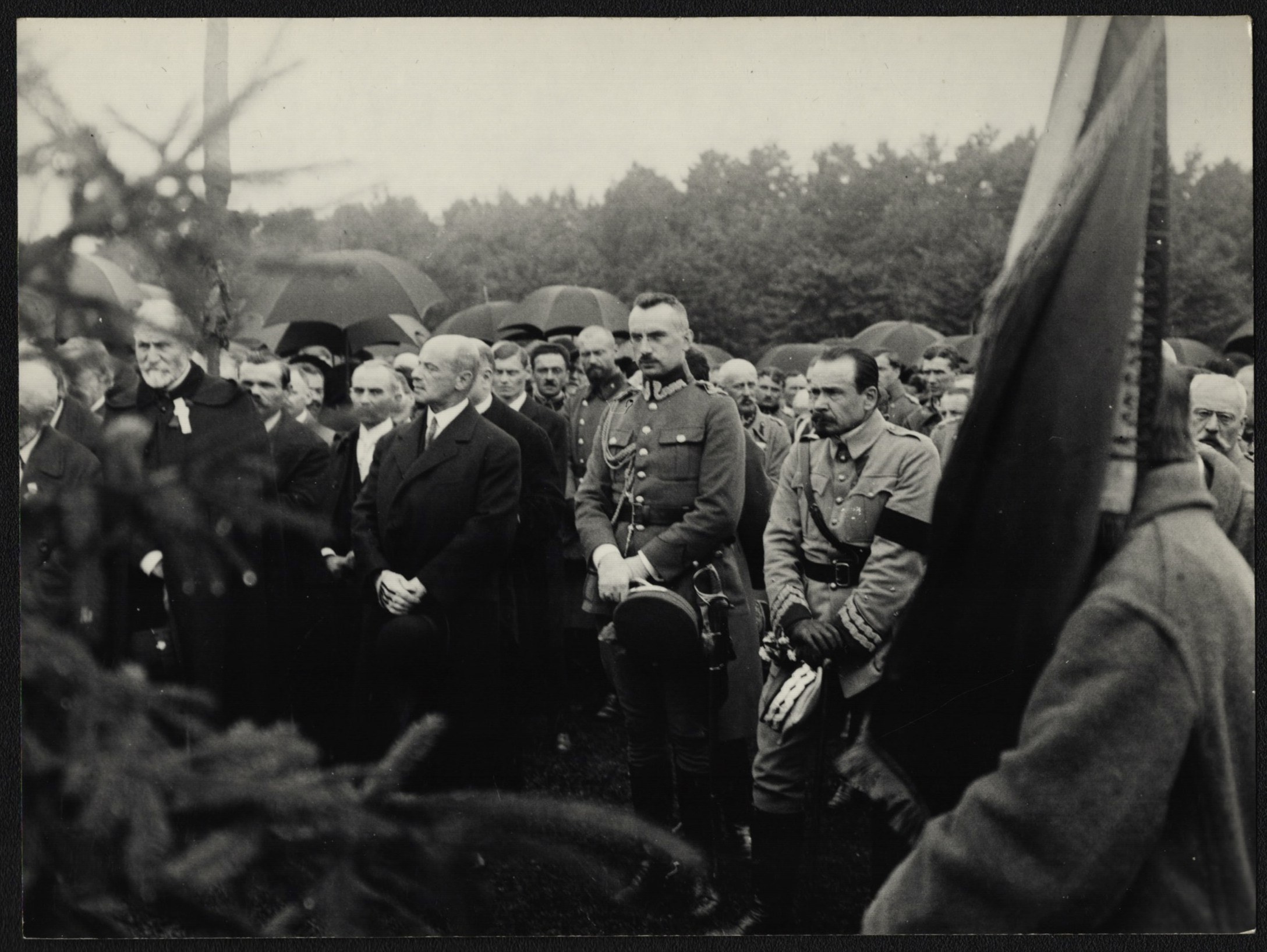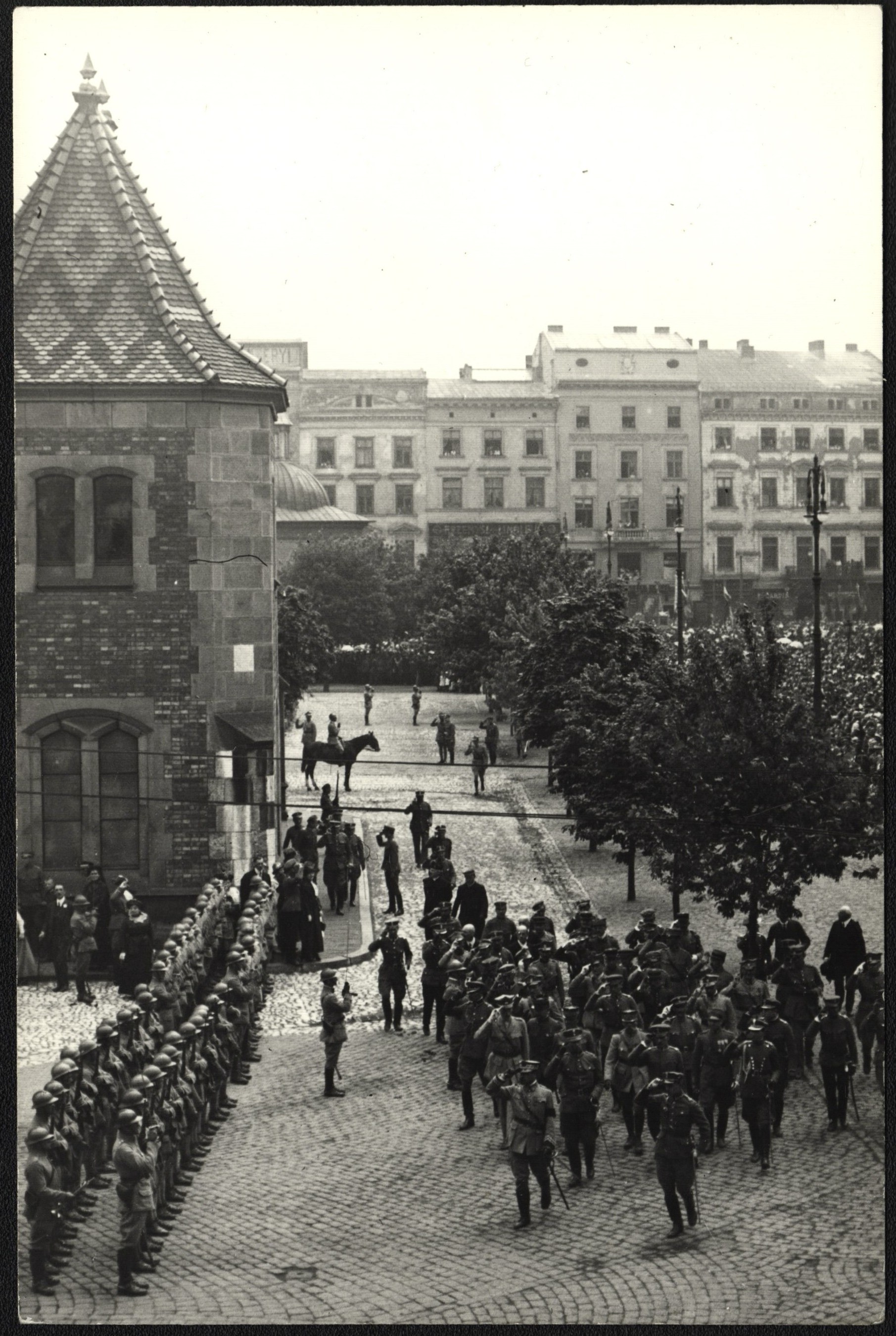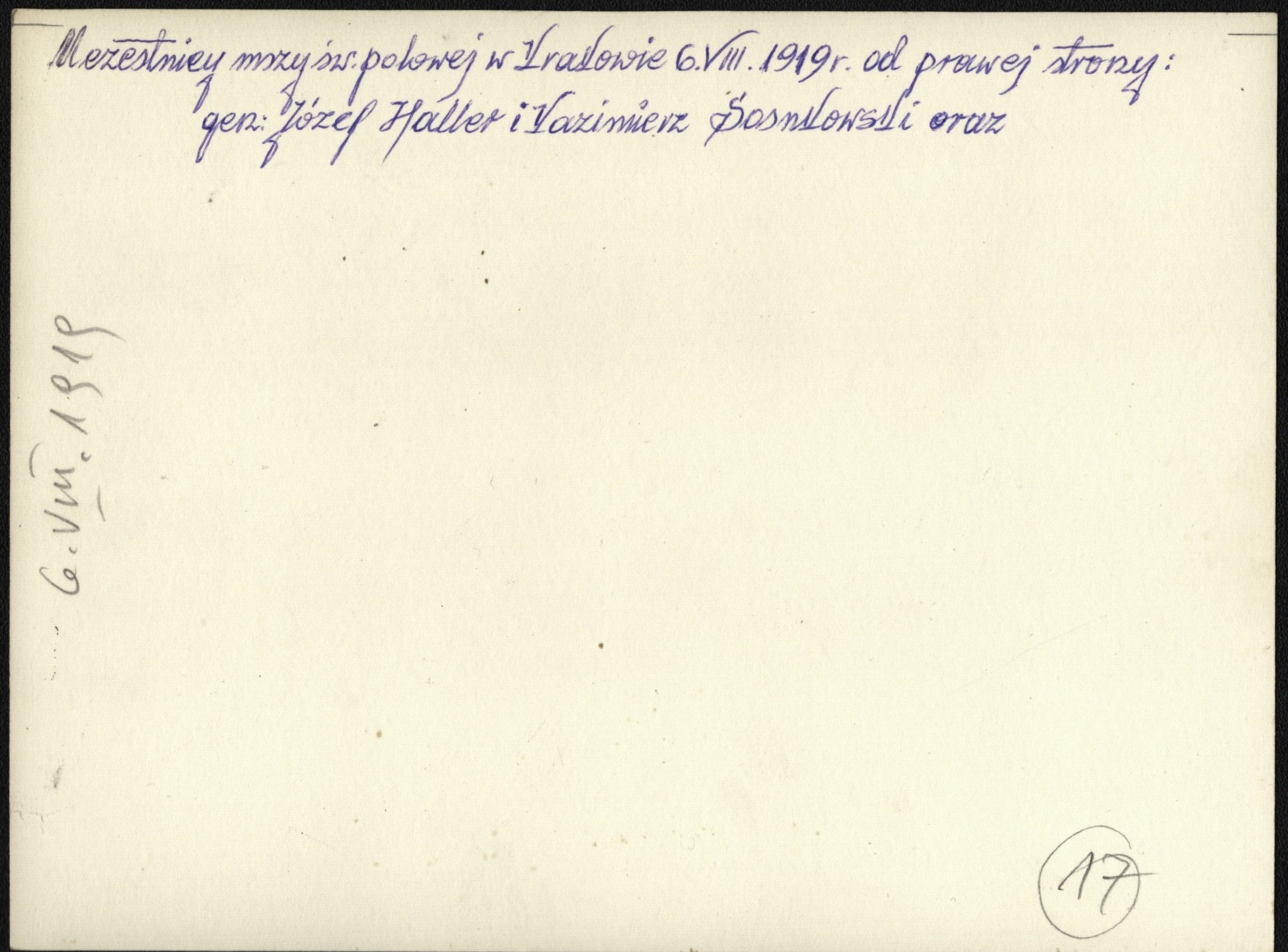 Uczestnicy mszy św. polowej w Krakowie podczas obchodów Święta Żołnierza, upamiętniającego rozpoczęcie działań przez Pierwszą Kompanię Kadrową pod dowództwem Józefa Piłsudskiego. Fotografia dat. na rewersie i opisana: 6. VIII.1919 r. od prawej: gen. Józef Haller i gen. Kazimierz Sosnkowski. Fotografia o wymiarach 13,2 x 18 cm. (17)