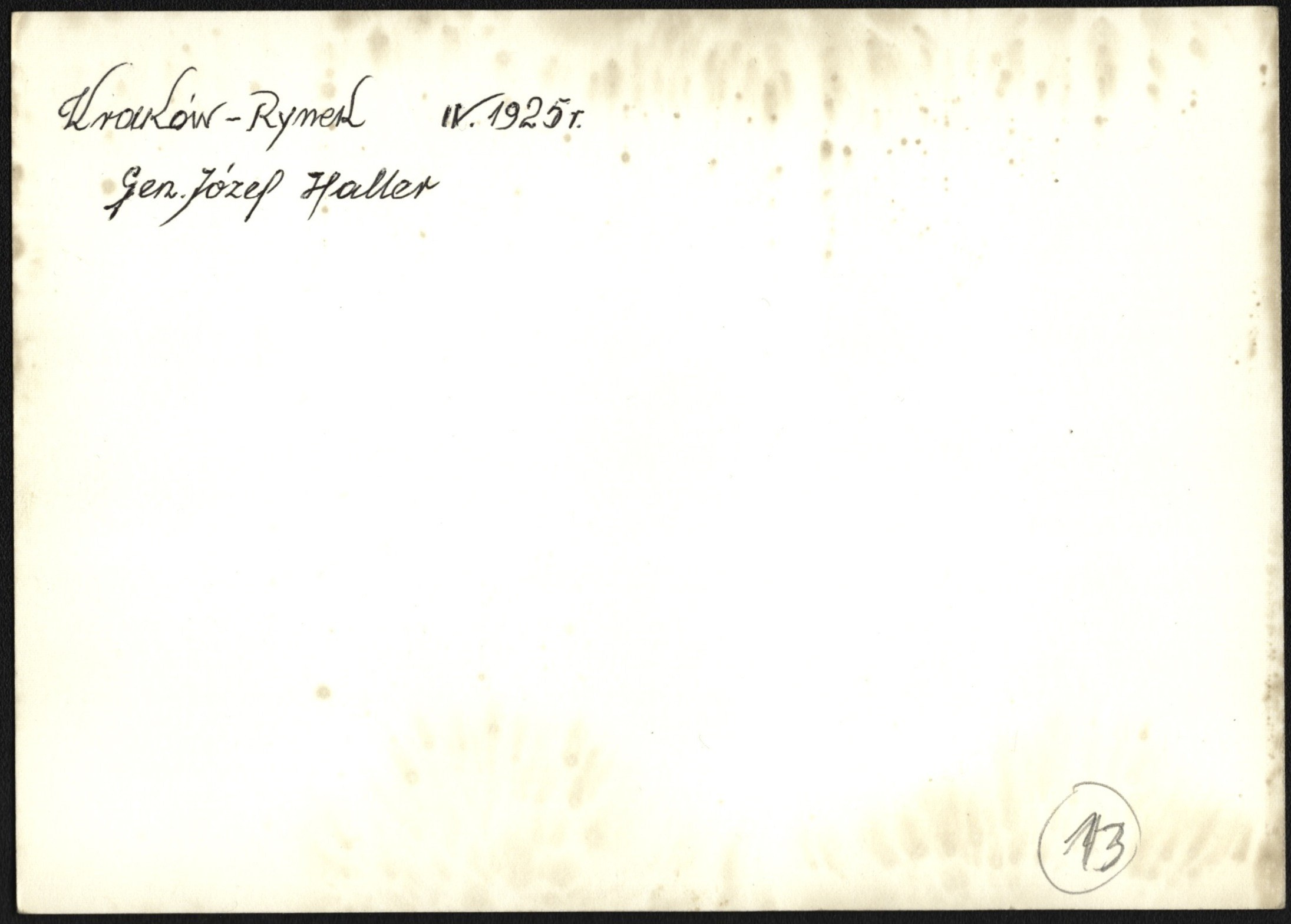 Gen. J. Haller na koniu podczas uroczystości. Kraków-Błonia VII 1919 r. Fotografia o wymiarach 13,3 x 18,3 cm. (28)