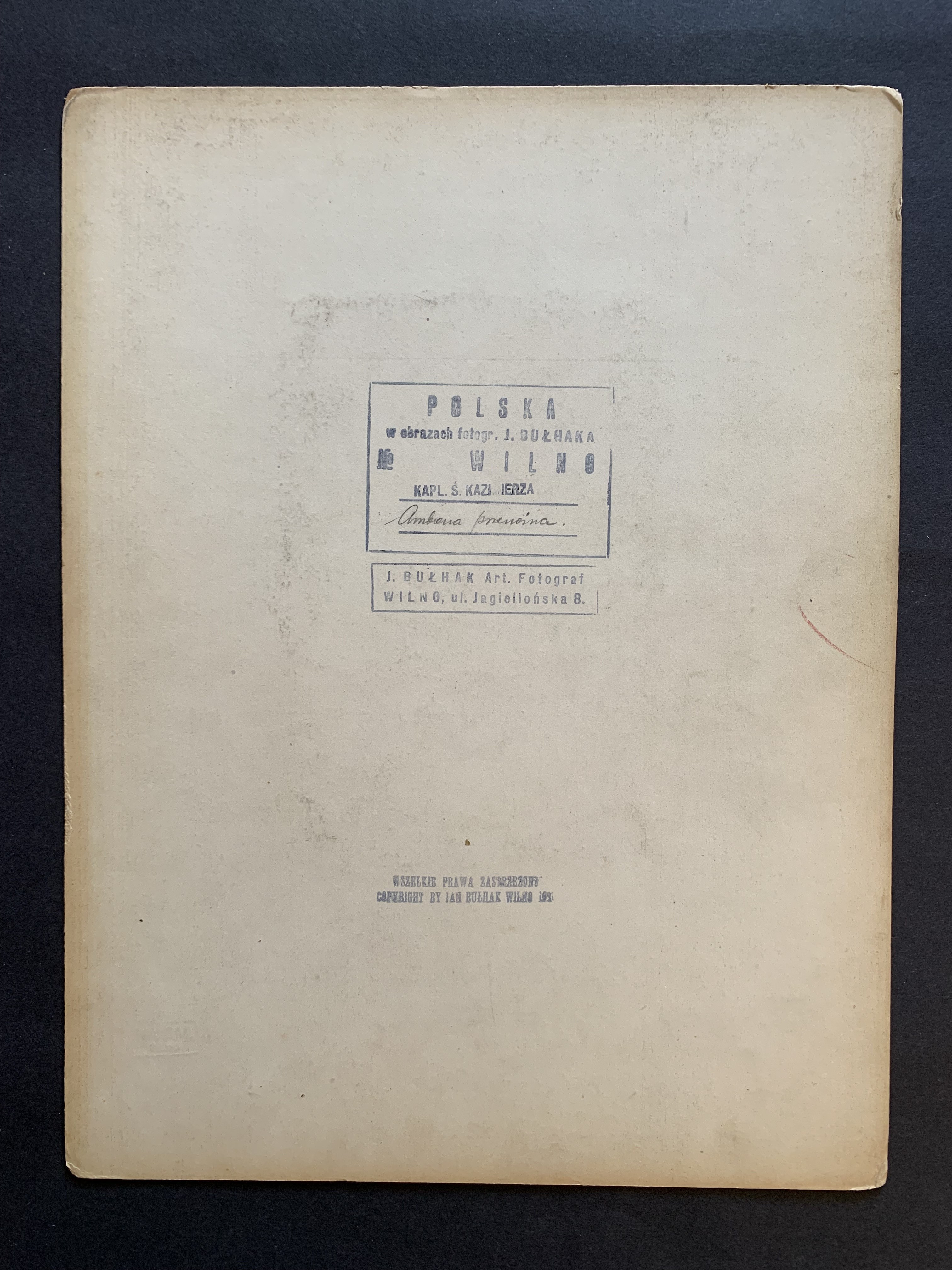 Oryginalny podkład kartonowy, oznaczony w p.g.r. ołówkiem „21”, suchy tłok: Jan Bułhak Wilno, na verso pieczęcie cyklu i copyright. Lit.: "Polska w krajobrazie..." (s. 242) - Katedra. Kaplica św. Kazimierza. Kazalnica Skargi.