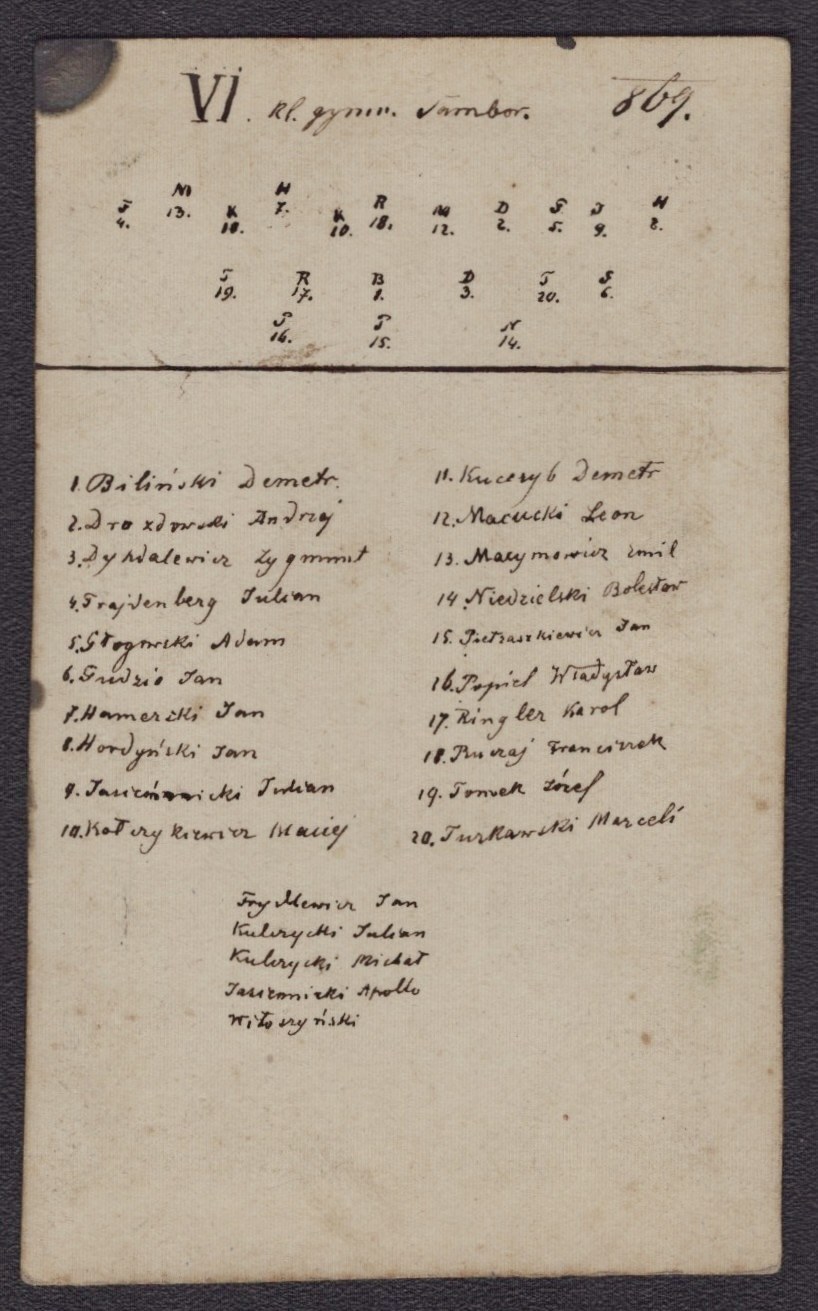 Na rewersie ponumerowano w epoce i podpisano przedstawione postaci - absolwentów gimnazjum (m. in. Jan Pietraszkiewicz, Władysław Popiel, Michał i Julian Kulczycki).