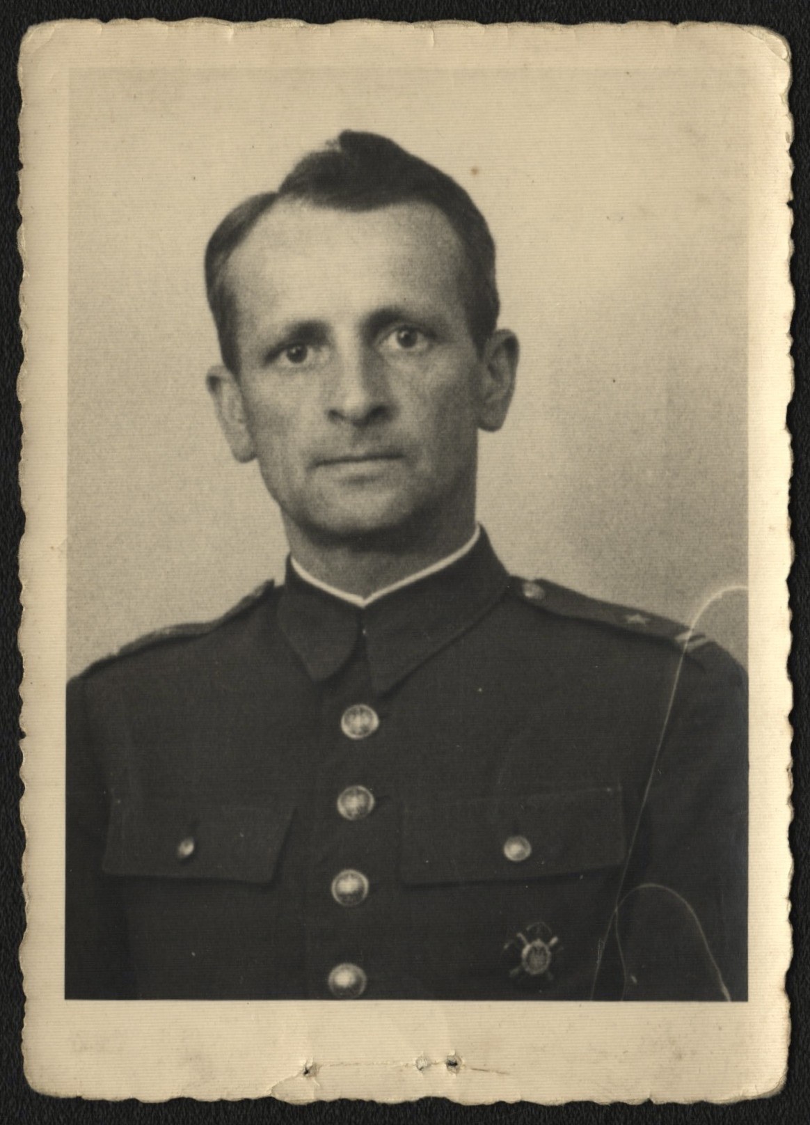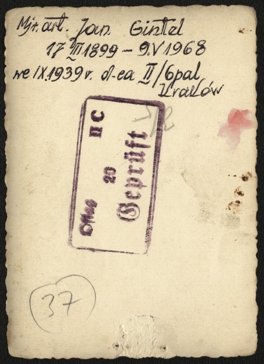 Fotografia z oflagu] Fotografia Mjr. Art. Jana Gintla, dowódcy 6 Pułk Artylerii Lekkiej. Pieczątka Oflag II C Woldenberg