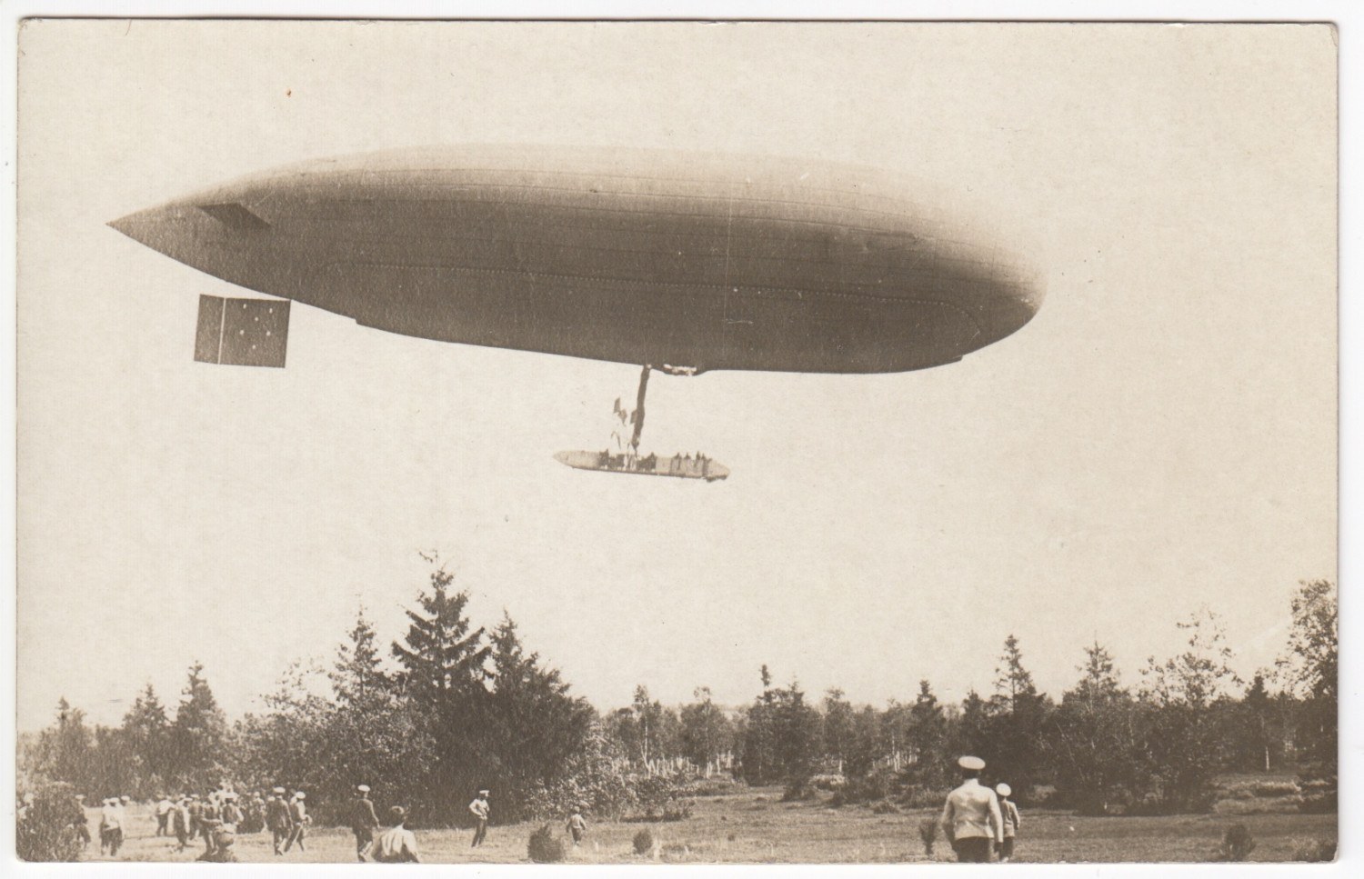 Russian Empire Photocard – Military Zeppelin in Flight Over Forest with Officers, ca. 1910s