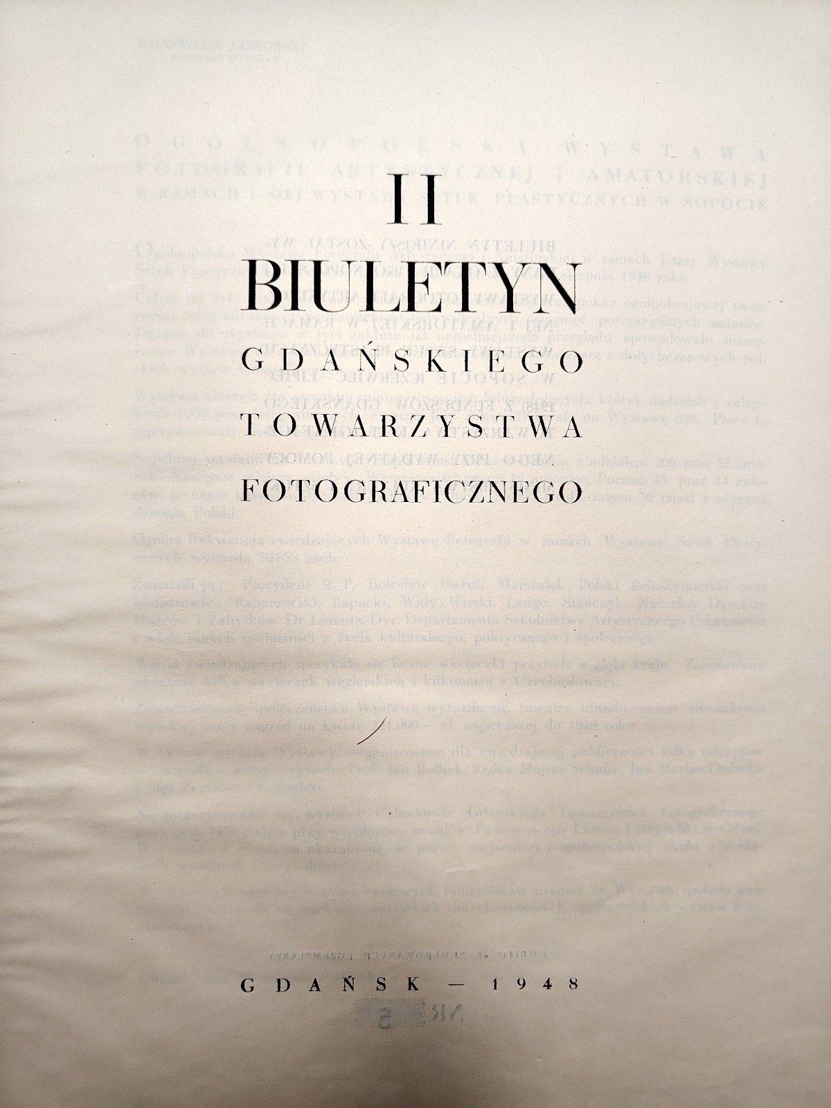 Prezentowany Drugi Biuletyn Gdańskiego Towarzystwa Fotograficznego, wydany w 1948 roku, stanowi wyjątkowy dokument historii polskiej fotografii artystycznej tuż po II wojnie światowej. Publikacja została przygotowana z okazji Ogólnopolskiej Wystawy Fotografii Artystycznej i Amatorskiej, zorganizowanej w czerwcu i lipcu 1948 roku w Sopocie, w ramach szerszej wystawy sztuk plastycznych.