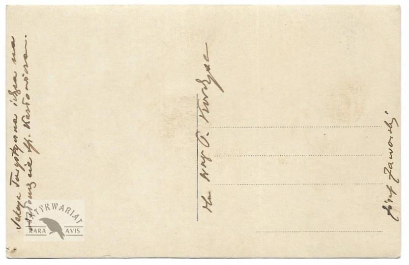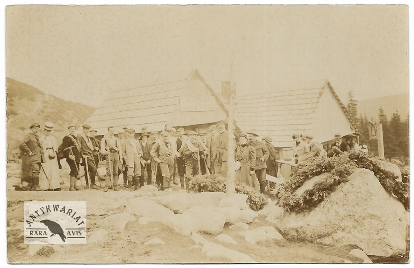[GÓRY - Karpaty - Tatry - w drodze na uroczystość odsłonięcia pomnika Mieczysława Karłowicza - fotografia sytuacyjna]. [nie po 25 VIII 1909]. Fotografia form. 9x14 cm.Członkowie sekcji turystycznej Towarzystwa Tatrzańskiego ujęci na tle starego schroniska Tow. Tatrz. na Hali Gąsienicowej, w drodze na uroczystość odsłonięcia pomnika Mieczysława Karłowicza, który zginął tragicznie 8 II 1909, przysypany lawiną pod Małym Kościelcem w Tatrach, podczas samotnej wędrówki na nartach. Na odwrocie odręczne atramentowe napisy: "Sekcya Turystyczna idąca na odsłonięcie sp. Karłowicza", "--- Kordysa", "Józef Jaworski" [Roman Kordys (1886-1934) i Józef Jaworski - fotografowie, wybitne postaci wspinania i narciarstwa]. Stan bardzo dobry. Rzadkie.