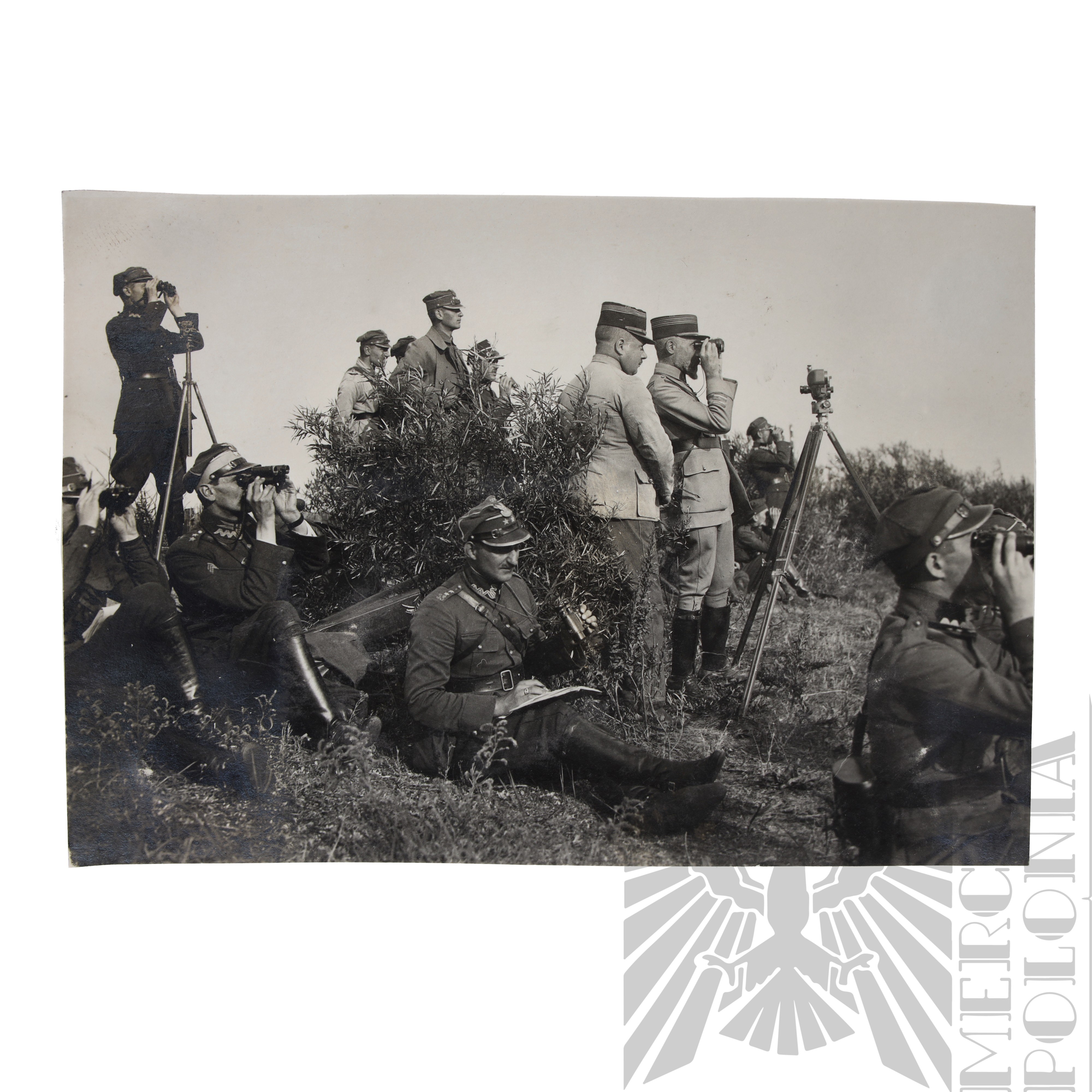 Fotografia grupowa oficerów Wojska Polskiego i Armii Francuskiej obserwujących manewry na poligonie. Dobrze widoczne mundury oficerskie wz.27 oraz rogatywki wz.19.