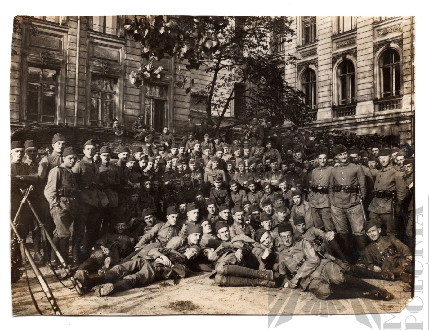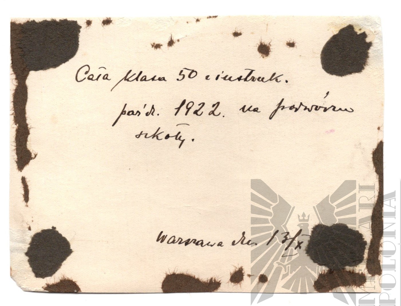 Fotografia grupowa żołnierzy Wojska Polskiego we wczesnym okresie formowania się państwa Polskiego. Na odwrocie fotografii napis "Cała klasa 50-ciutków. paźdz. 1922 na podwórzu szkoły. Warszawa dn. 13/X(?).
