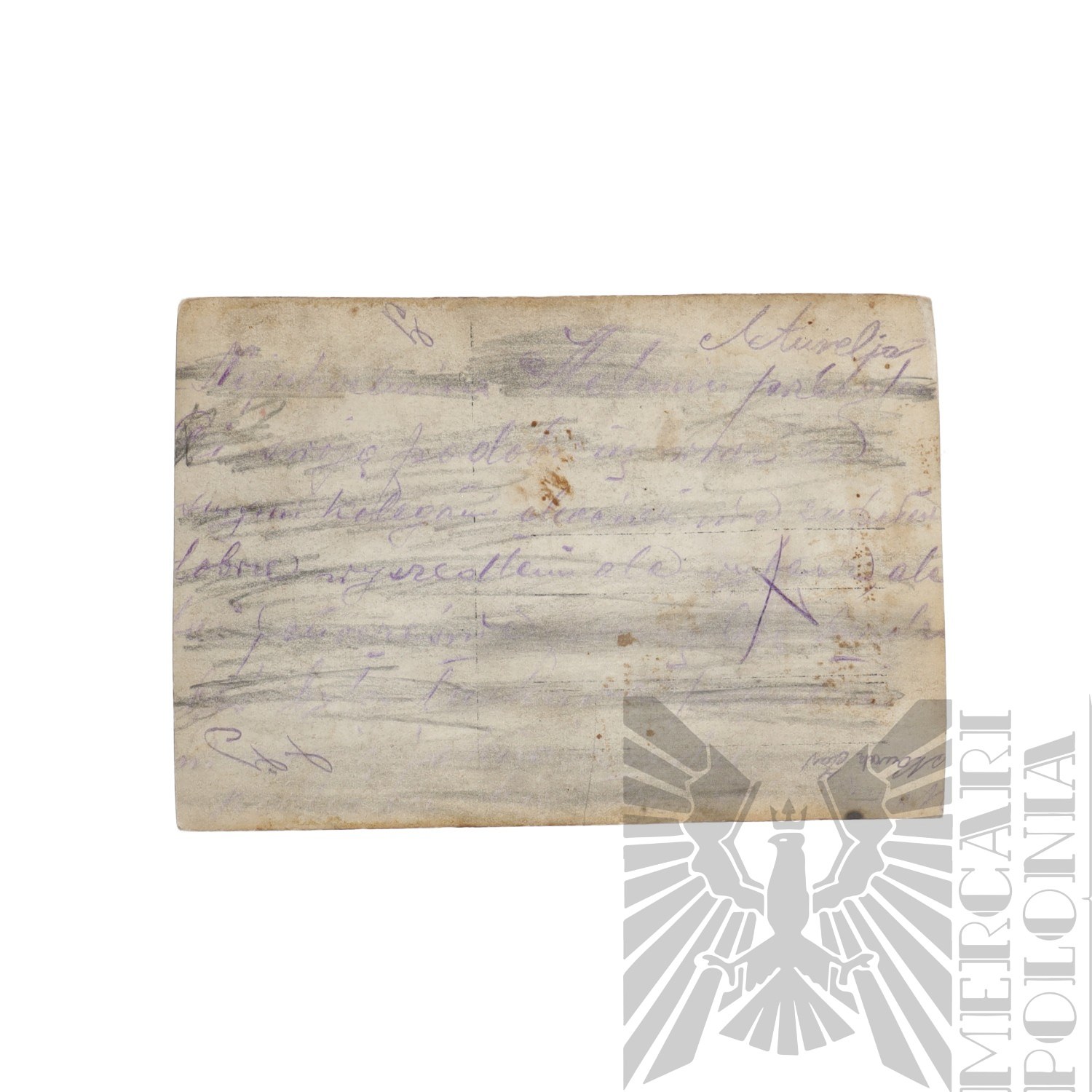 Fotografia studyjna żołnierzy Wojska Polskiego z wczesnego etapu formowania się, widoczne mandoliny oraz akordeon, żołnierze noszą czapki w typie maciejówek.
