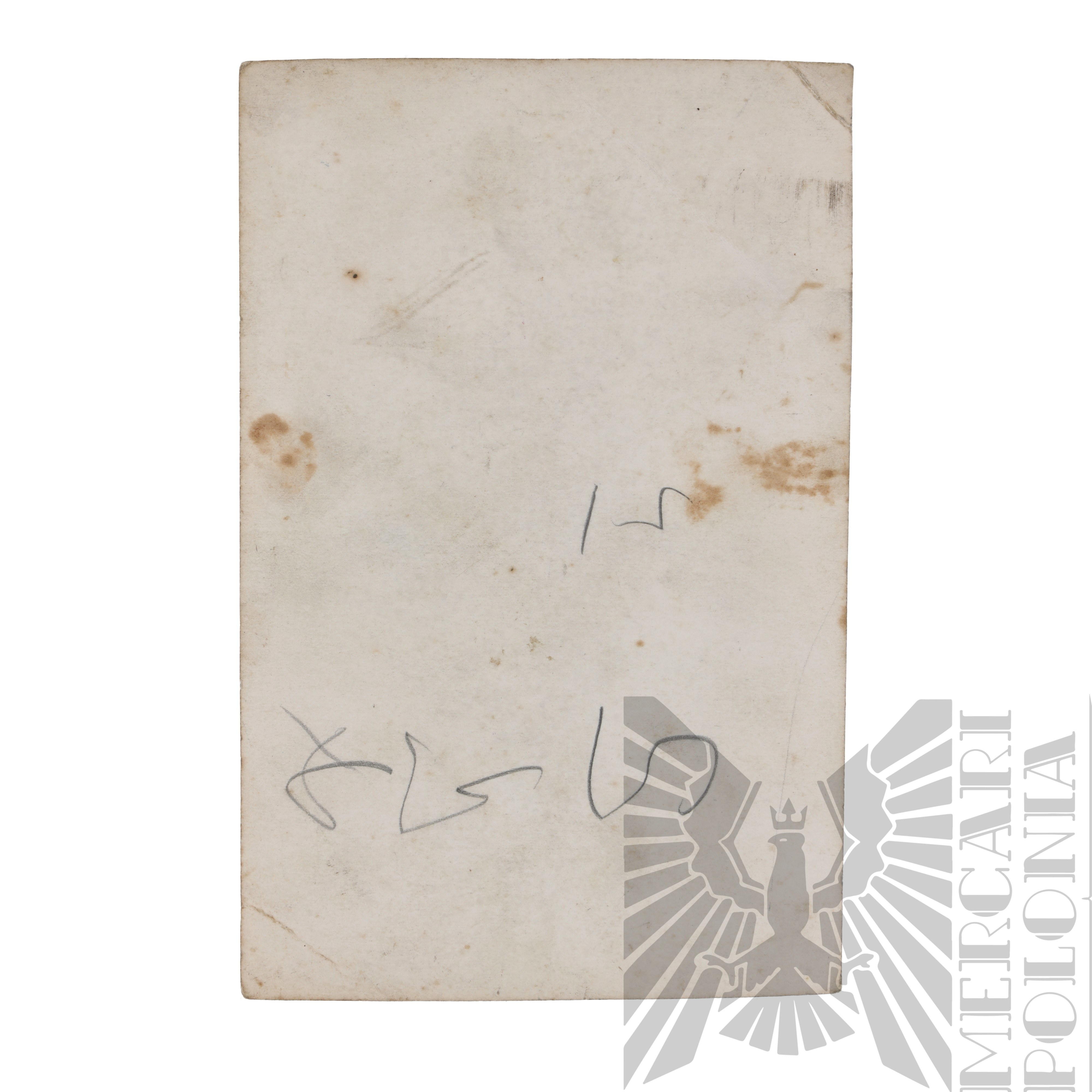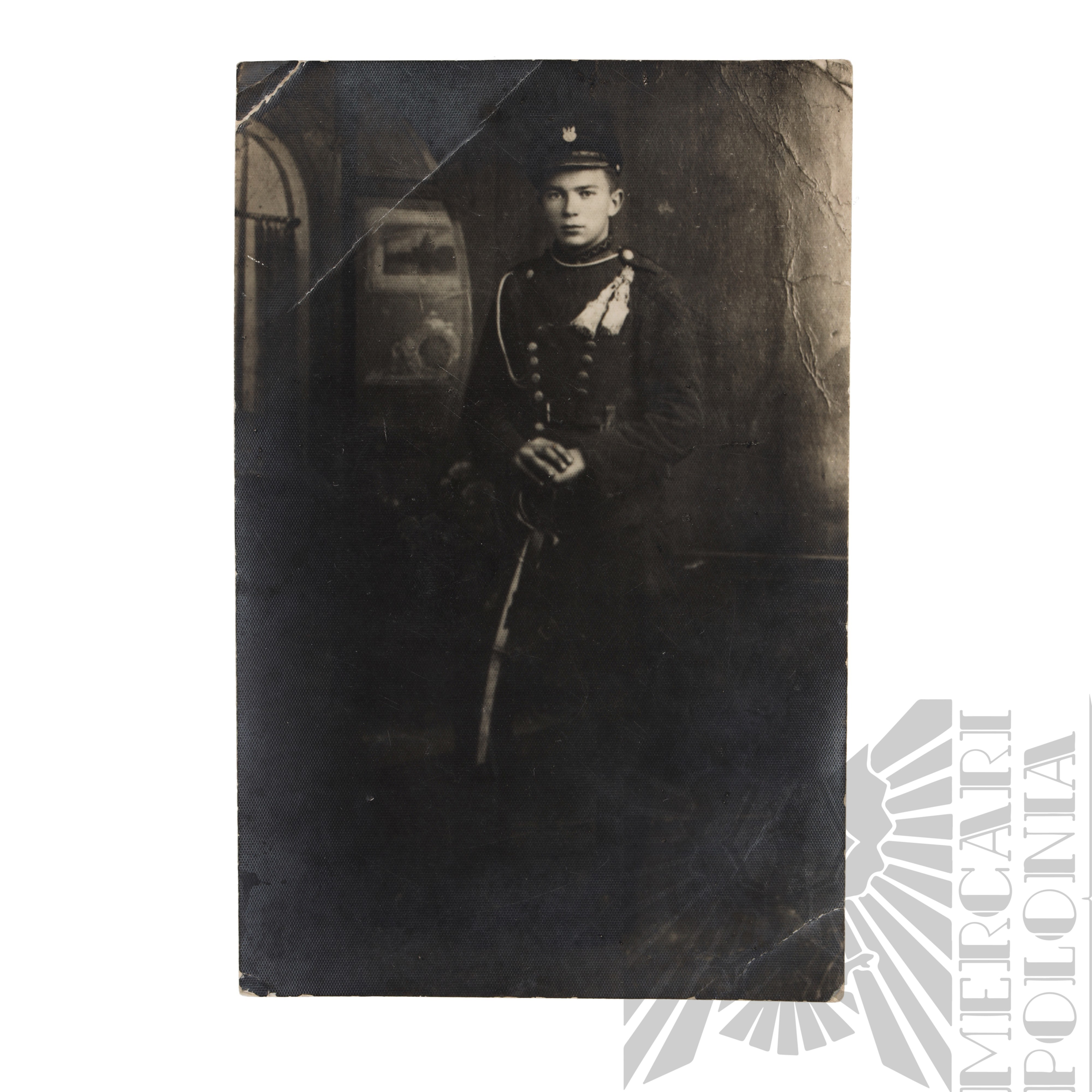 Fotografia studyjna żołnierza kawalerii Wojska Polskiego. Doskonale widoczna kurtka tzw. Ułanka wz.17, czapka wz.17 z orłem oraz szabla wz.17.