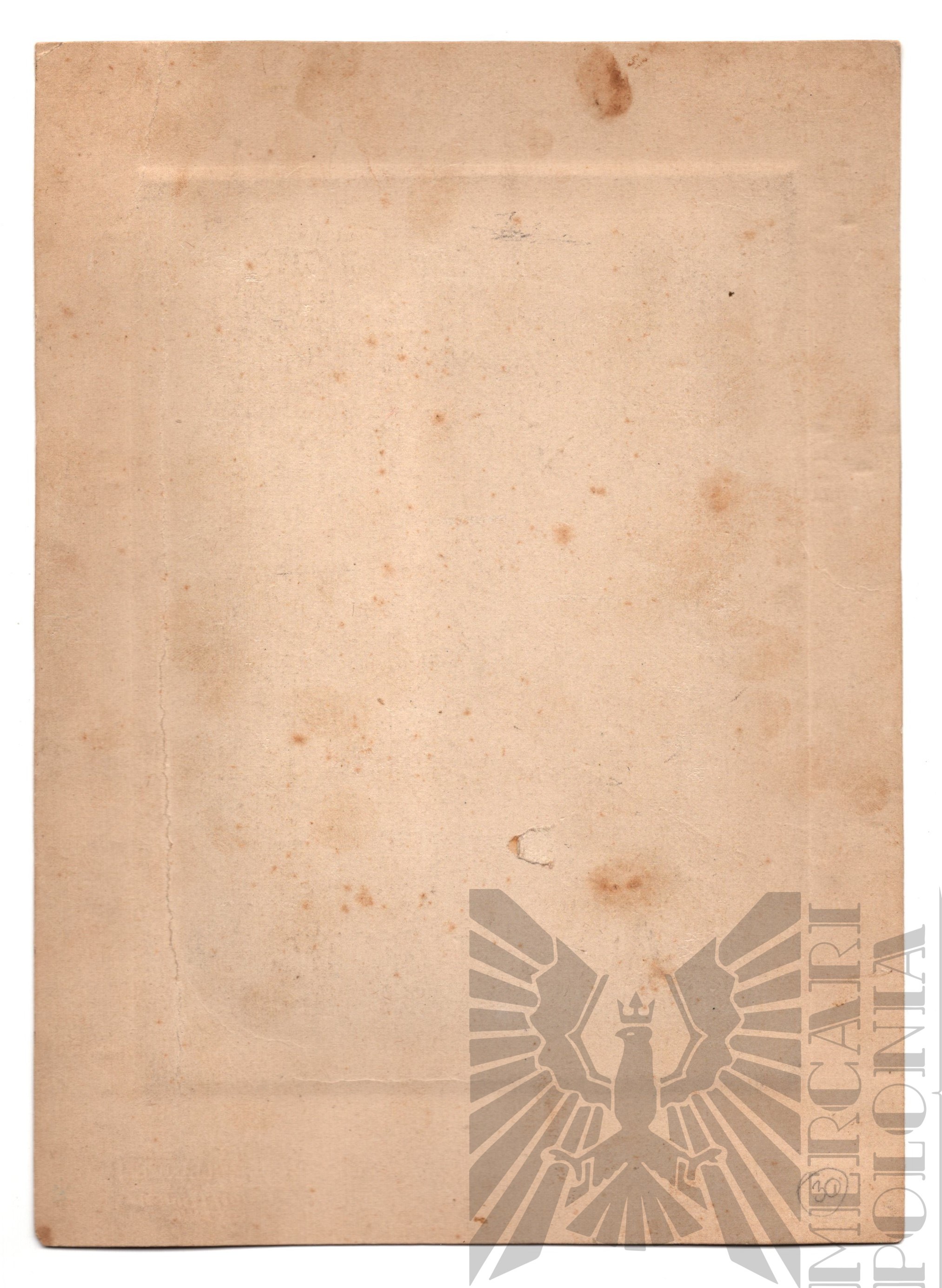 Fotografia studyjna żołnierza Wojska Polskiego. Dobrze widoczna rogatywka wz.19 z orłem wz.19, u dołu fotografii pieczęć “T.A.MASŁOWSKI HOTEL BRISTOL WARSZAWA”.