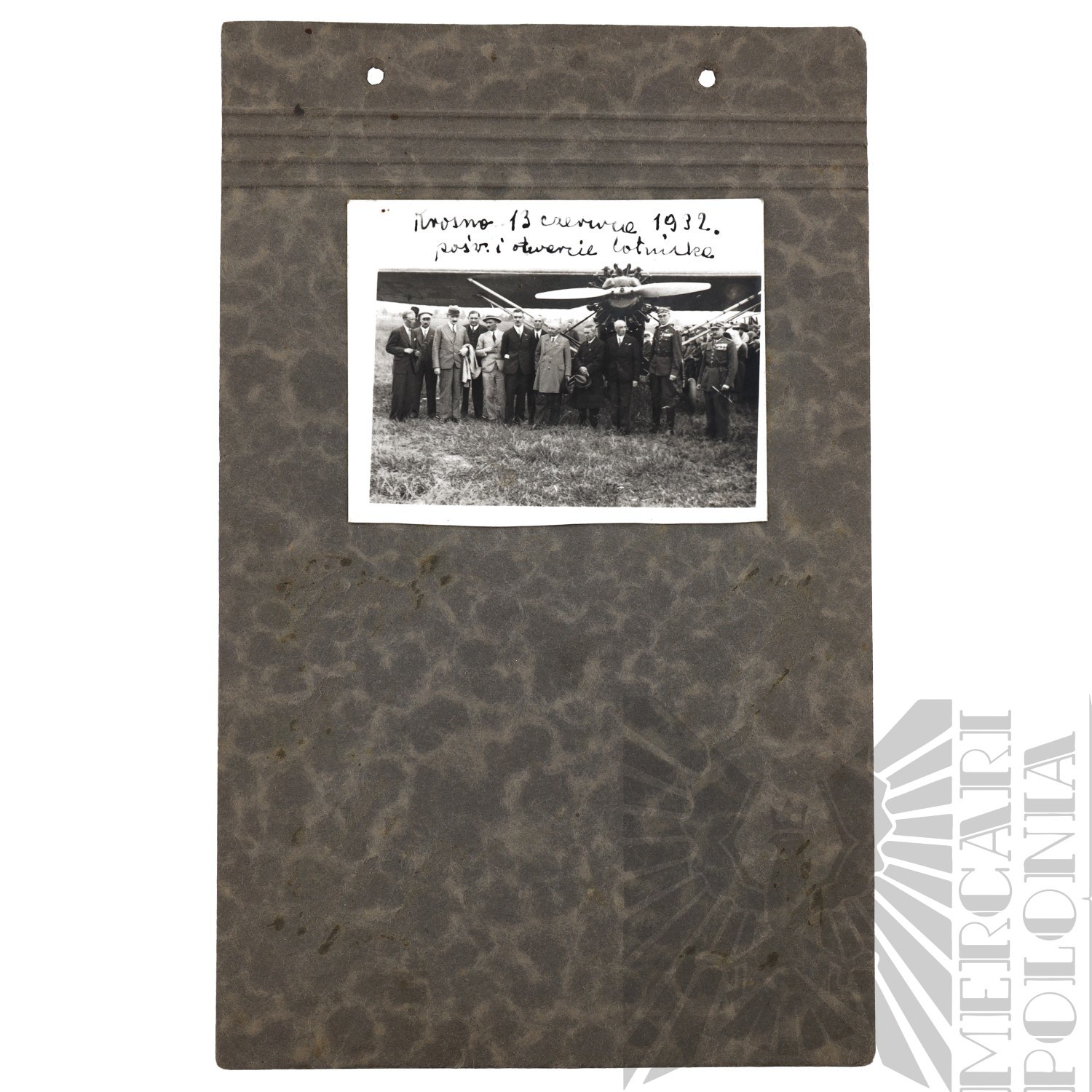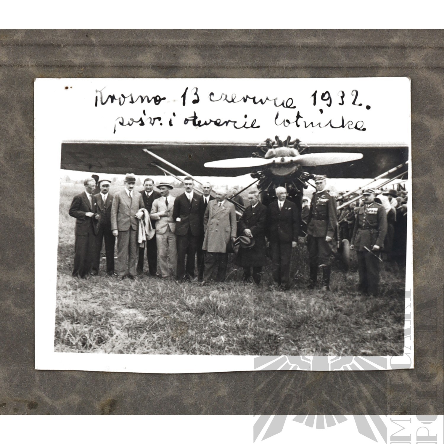 Zdjęcie przedstawia samolot na lotnisku w Krośnie podczas uroczystego otwarcia w 1932 roku, z widocznymi oficjelami i uczestnikami ceremonii. Fotografia opatrzona podpisem “Krosno 13 czerwca 1932 pośw i otwarcie lotniska”